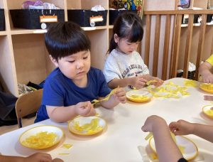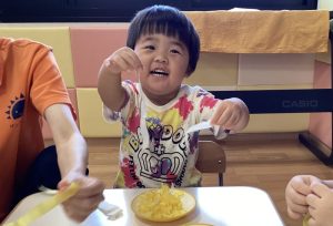お月見だんご見ると、思わず「パクパク」手を伸ばすお友だち😋
