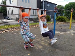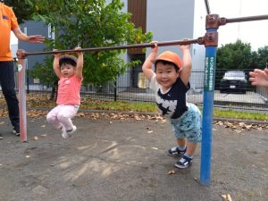 鉄棒では、ぶら下がれるようになり「せんせいみて❕」と