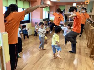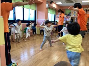 準備体操が終わると、もも組いちご組さんチームとりんご組さんチームに分かれます🍀