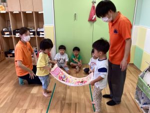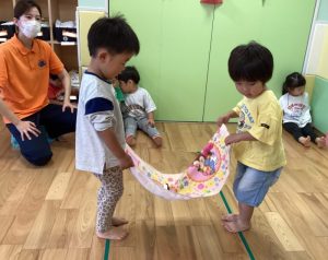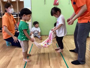 今回はタオルをもって、お友だちと一緒に横歩きで進む練習をしました🙌