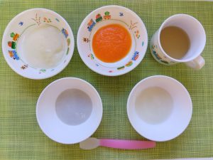 (写真は離乳食後期です。年齢によって形、固さ、盛り付け量を変えて、提供しています。)