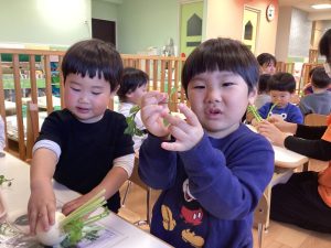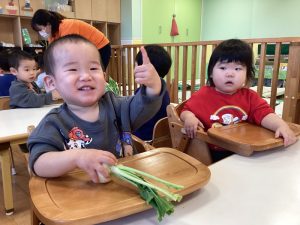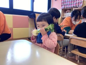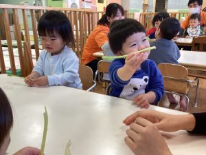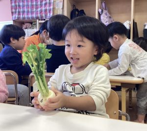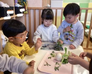 保育士のお話しを聞いてから、カブと七草に触れてみました🙌