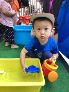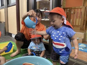 保育士の足にお水をかけてくれるお友だちもおり、