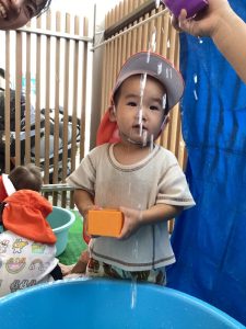 保育士と一緒に水の冷たさや心地よさを感じているようでした☺️