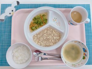 (写真は後期食です。月齢によって形、固さ、盛り付け量を変えて提供しています。)