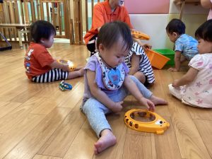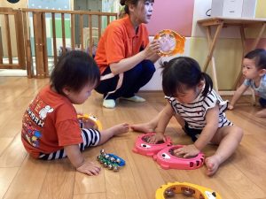 タンバリンを床に置いてタイコのようにたたくお友だち🥁