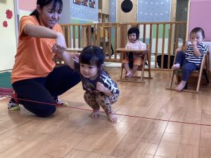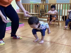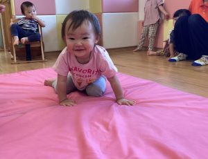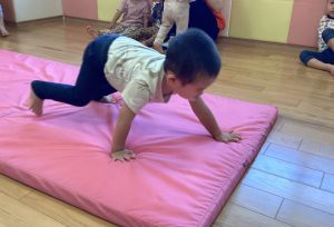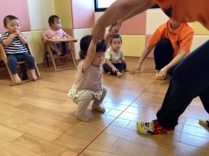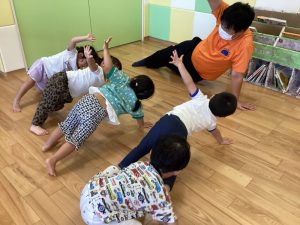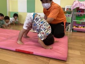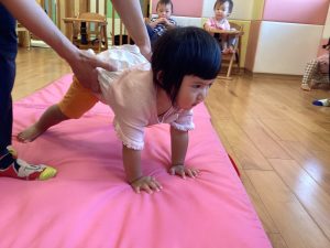 保育士に支えられて膝とお尻をあげる『クマ歩き』にも挑戦しました🐻