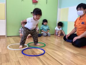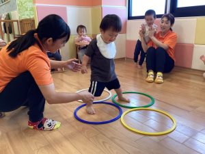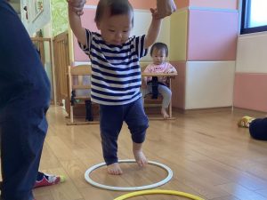フープの保育者の手伝いなしで、ケンパで進むことができていました😊