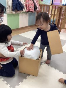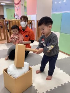 もも組、いちご組さんはお餅つき遊びをしました🍊