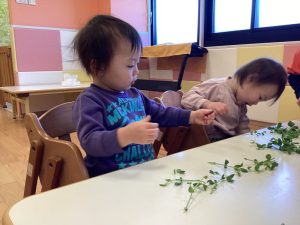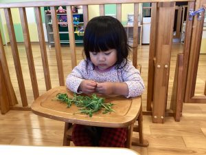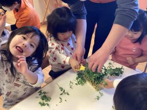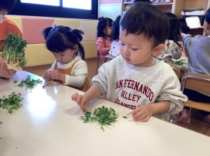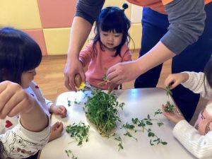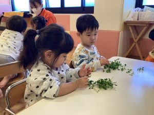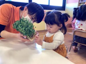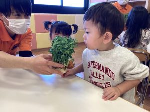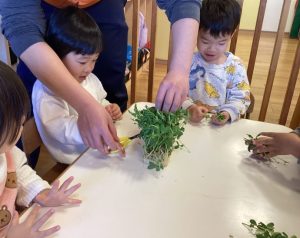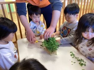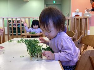 もも組、いちご組さんは保育者が切った豆苗を触ってみました🌟