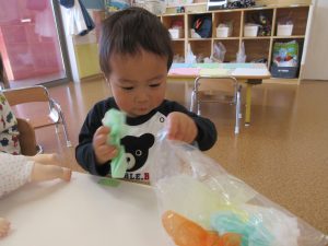 長いお休みで登園時は泣けてしまう姿も見られましたが、部屋に入ると楽しい様子を思い出したのか笑顔に戻りお気に入りのおもちゃで遊び始める姿が見られましたよ
