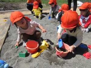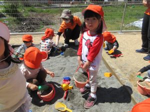 よーい、どん!!と園庭でかけっこをしたり、砂場でお山を作ったり型抜きをしてあそびました園庭の向かい側にある畑に咲いているタンポポを見つけたり、空を飛ぶ飛行機など?子どもたちの目はとってもいい目でよく見つけてくれます