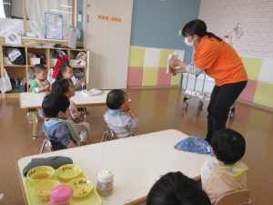 なじみのあるりんごやばななが出てくるので子どもたちもくぎ付けで見ています![]()