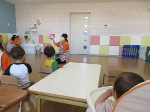 『おこったかお』『あまーいかお』『すましたかお』、、、色々な表情の絵に子どもたちも真似っこしたりじーっと見て楽しんでいましたよ![]()