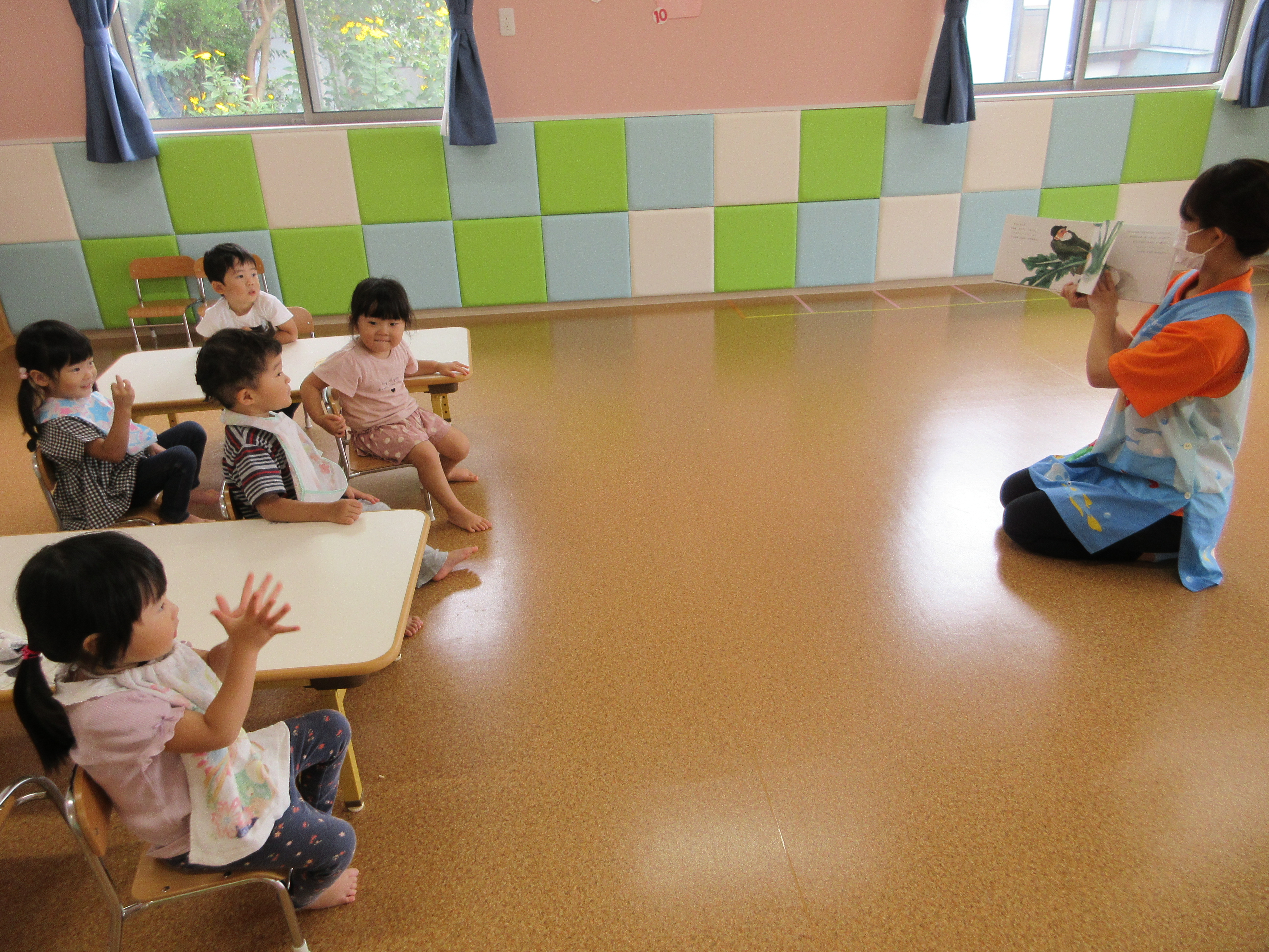 保育室の絵本は子どもたちの様子や季節に合わせて定期的に入れ替えをしますが、この絵本は4月当初から人気のある子どもたちお気に入りの絵本です