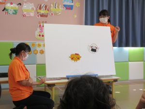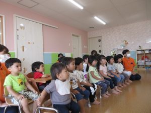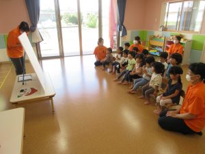 先生たちが歌う歌に合わせておにぎりくんやそのお友だちが動くのが楽しくて真剣に楽しんでみていました![]()