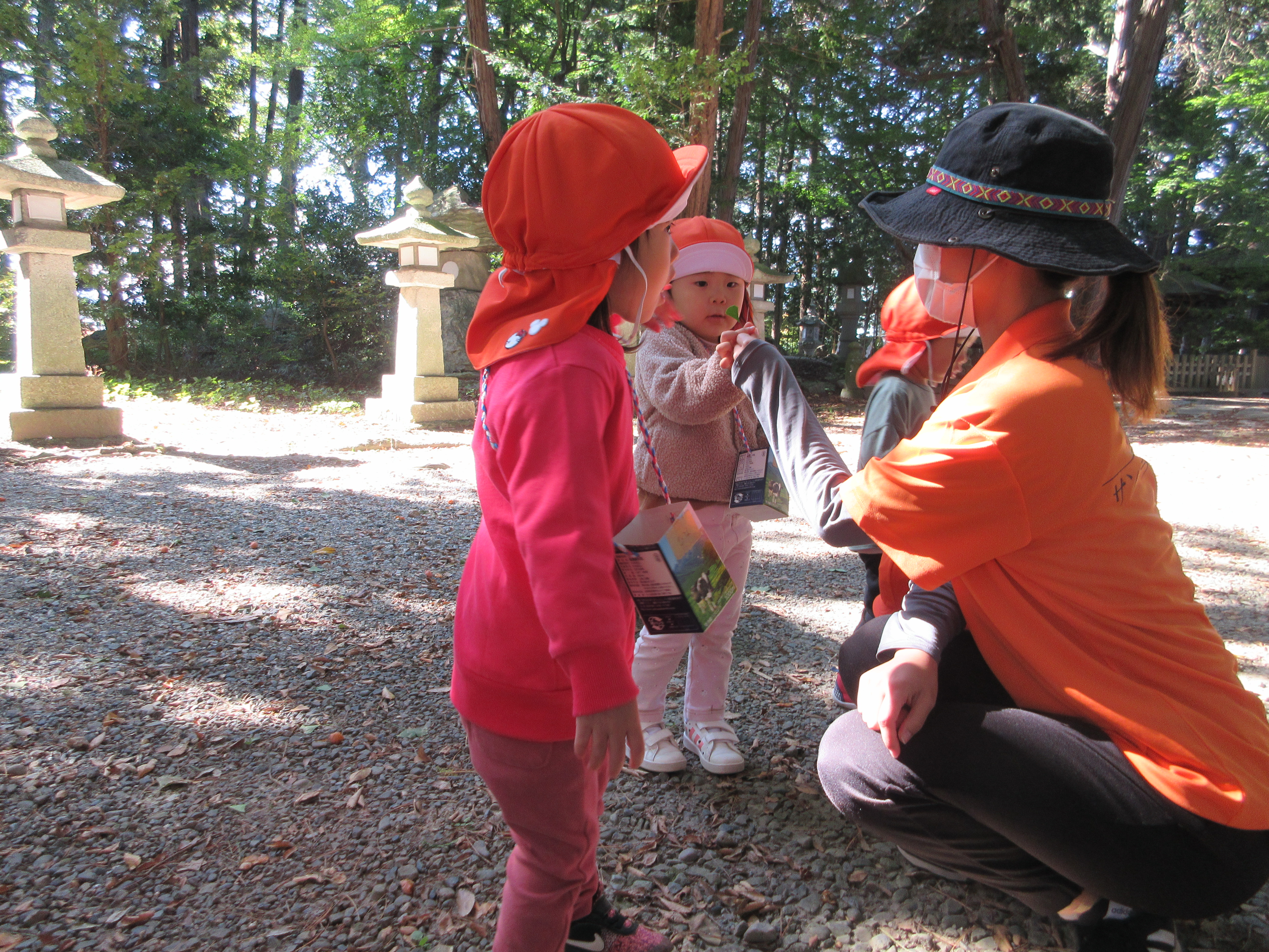 保育士と一緒に小さいイチョウの葉っぱを見つけるのを楽しんだりんごぐみのお友だち