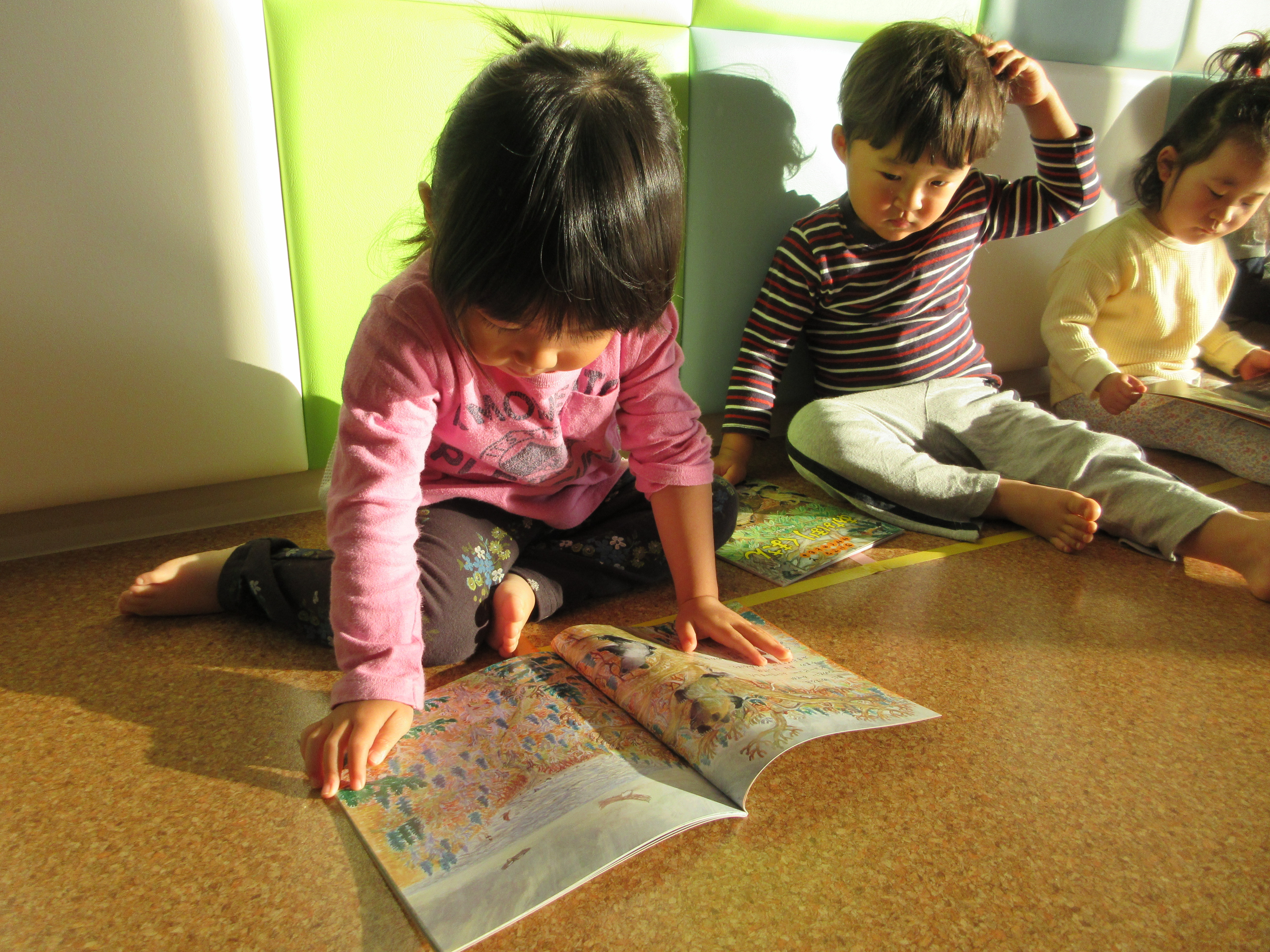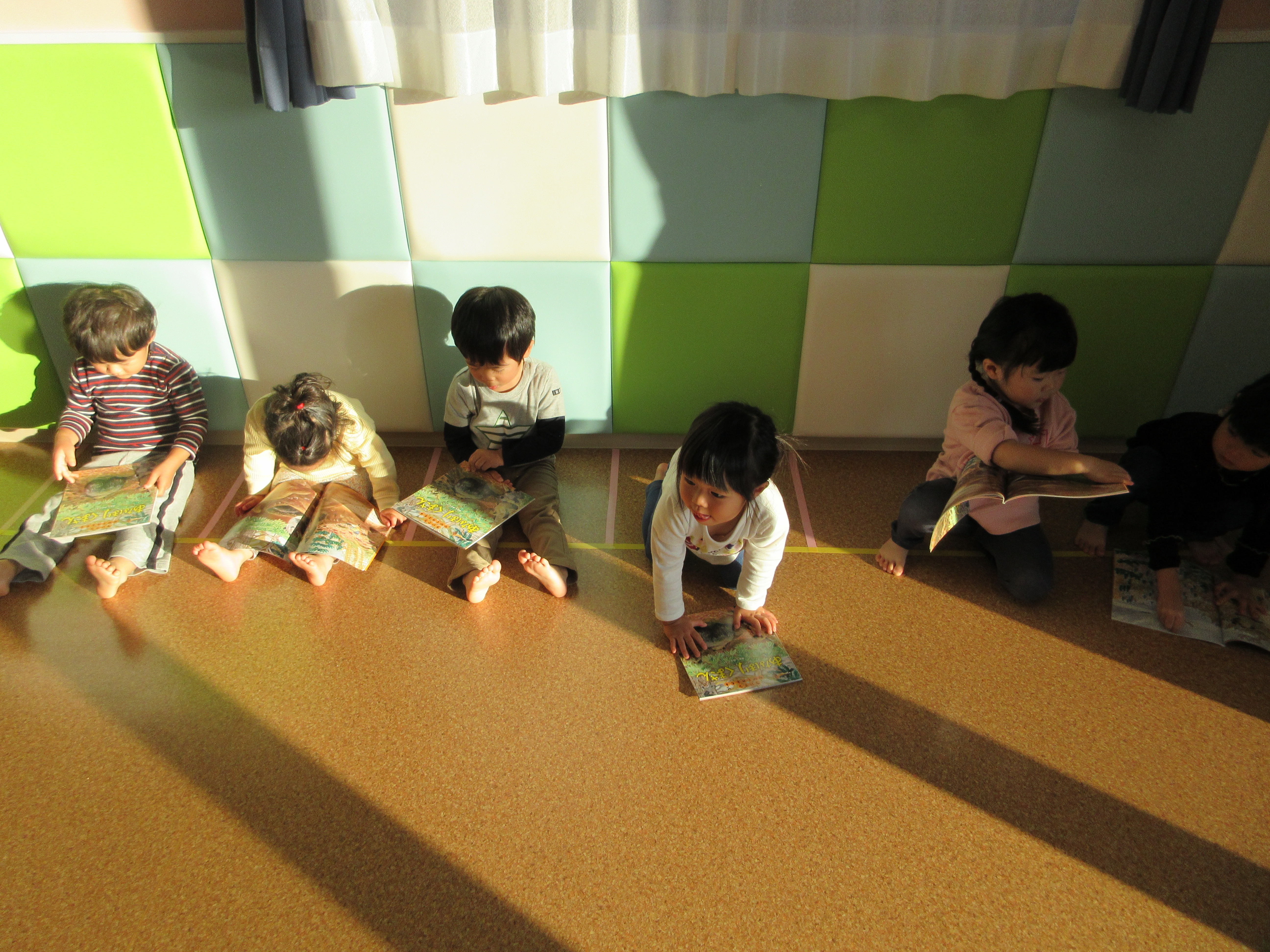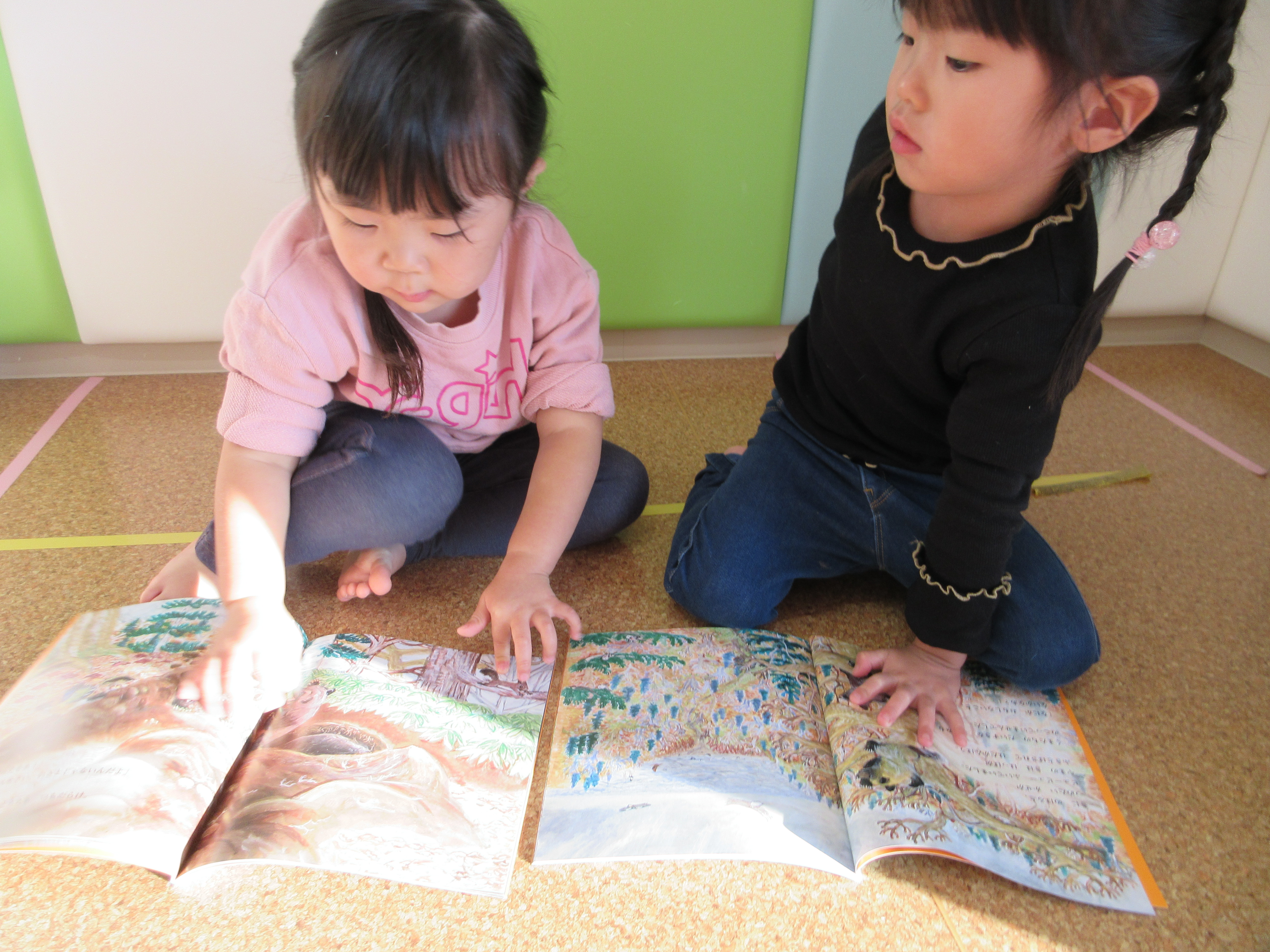 保育士が読み聞かせるのもいいですが、こんな風に自分のペースでページをめくったりじっくり読む機会を設けたりして楽しんでいます![]()