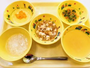 粥 味噌汁 豆腐の野菜あんかけ煮 くず煮(きゅうり・にんじん) みかん缶
