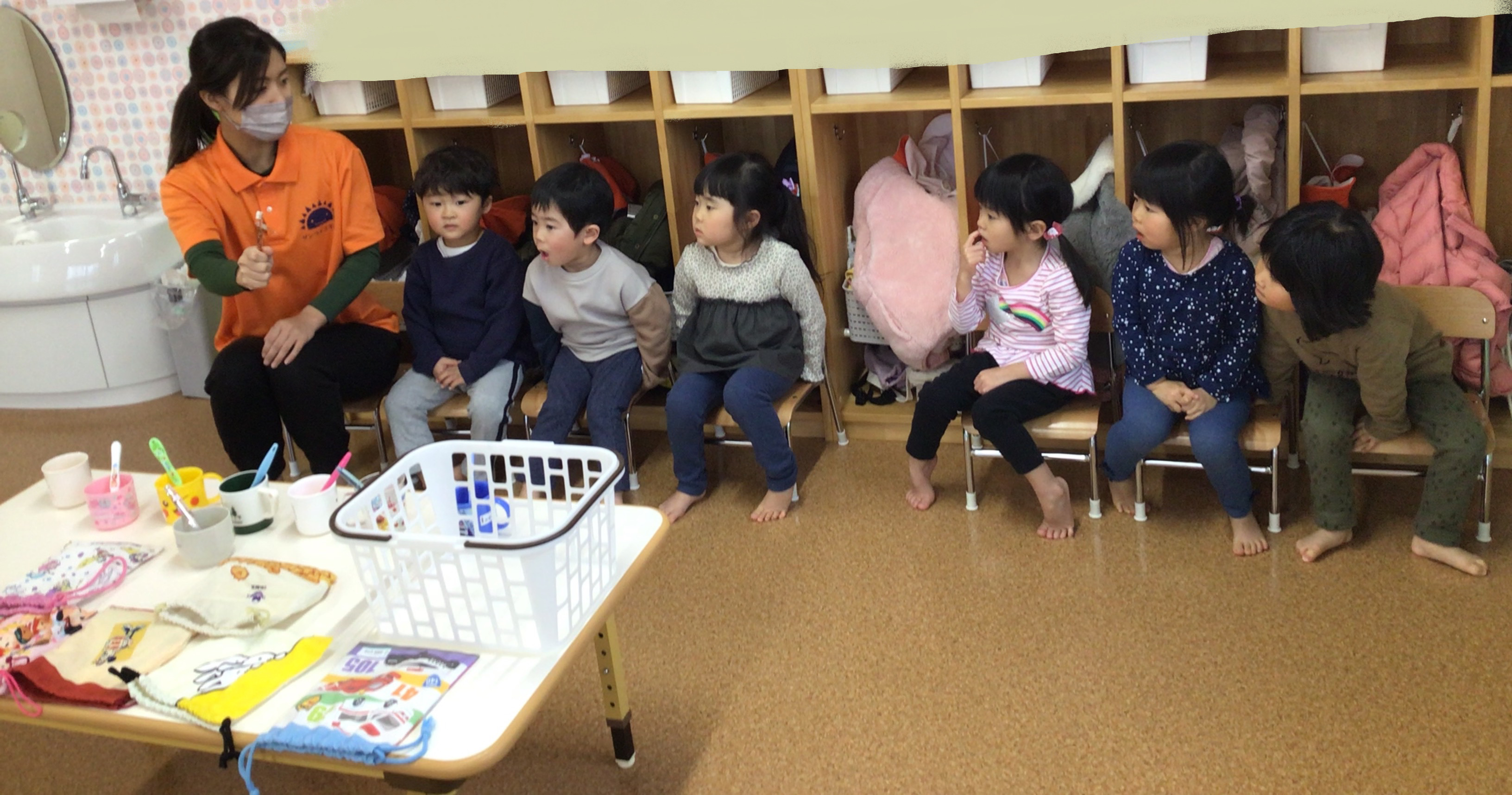 保育士に歯ブラシの持ち方や、歯磨きの時のお約束を聞いています![]()