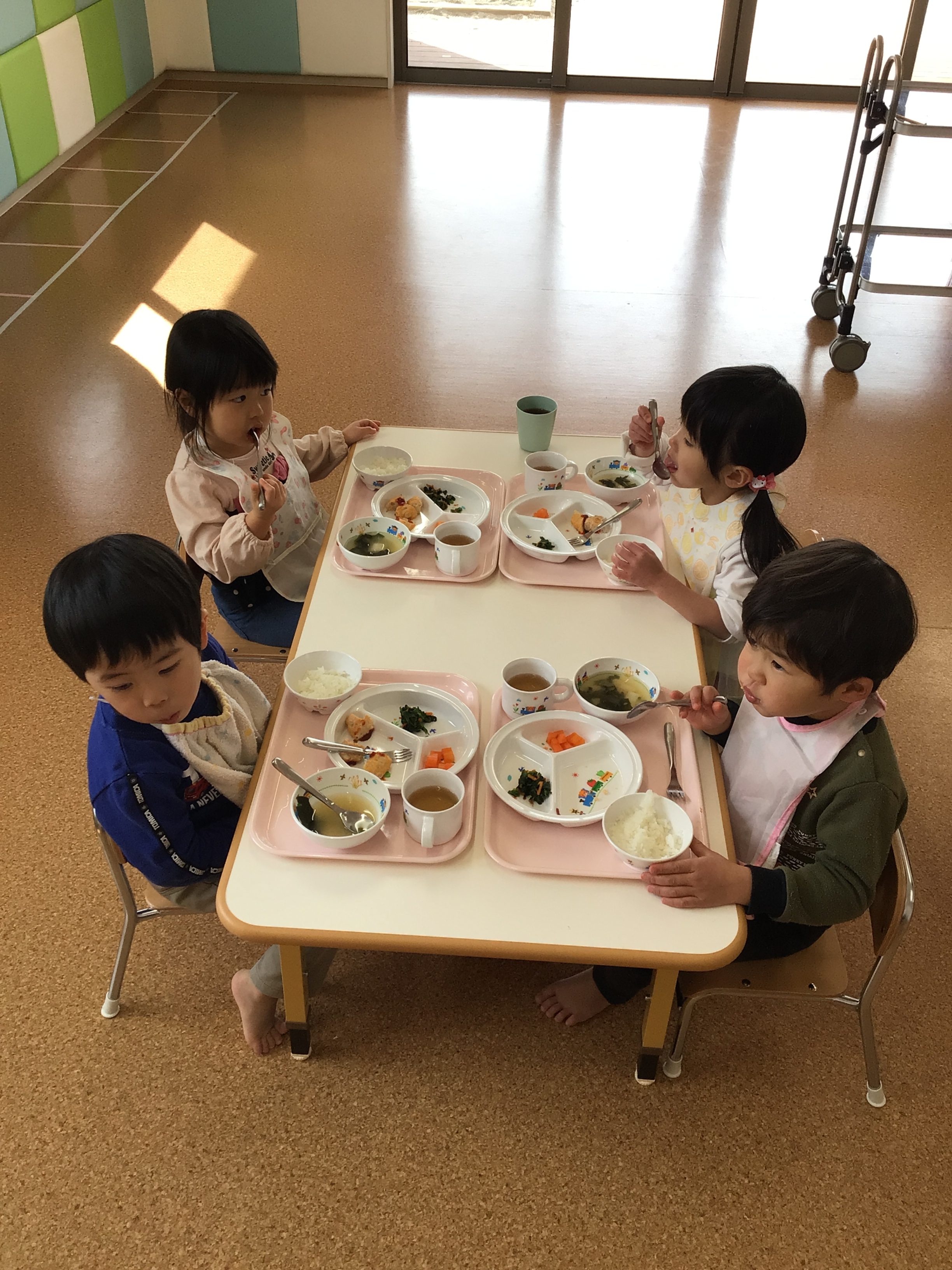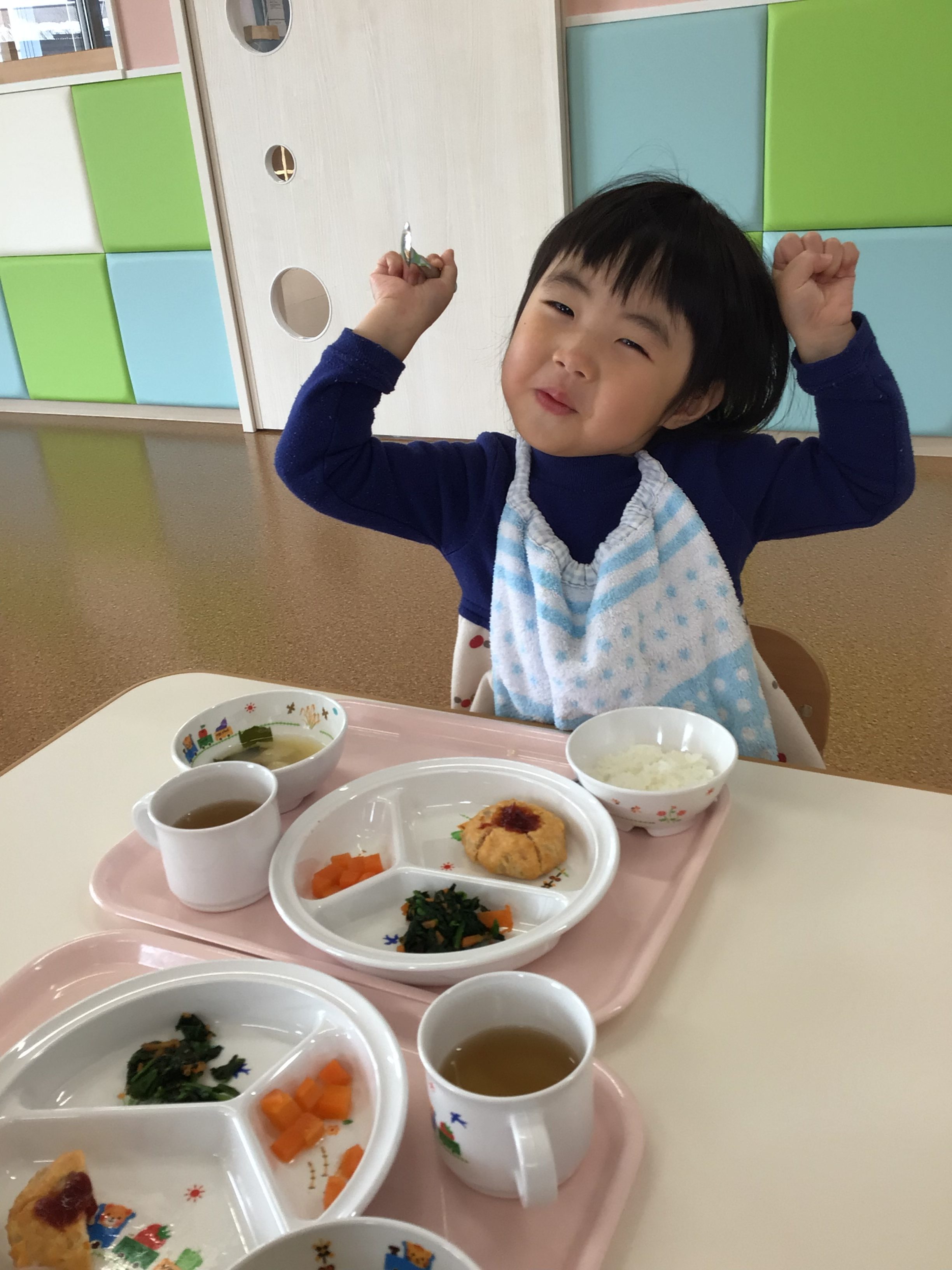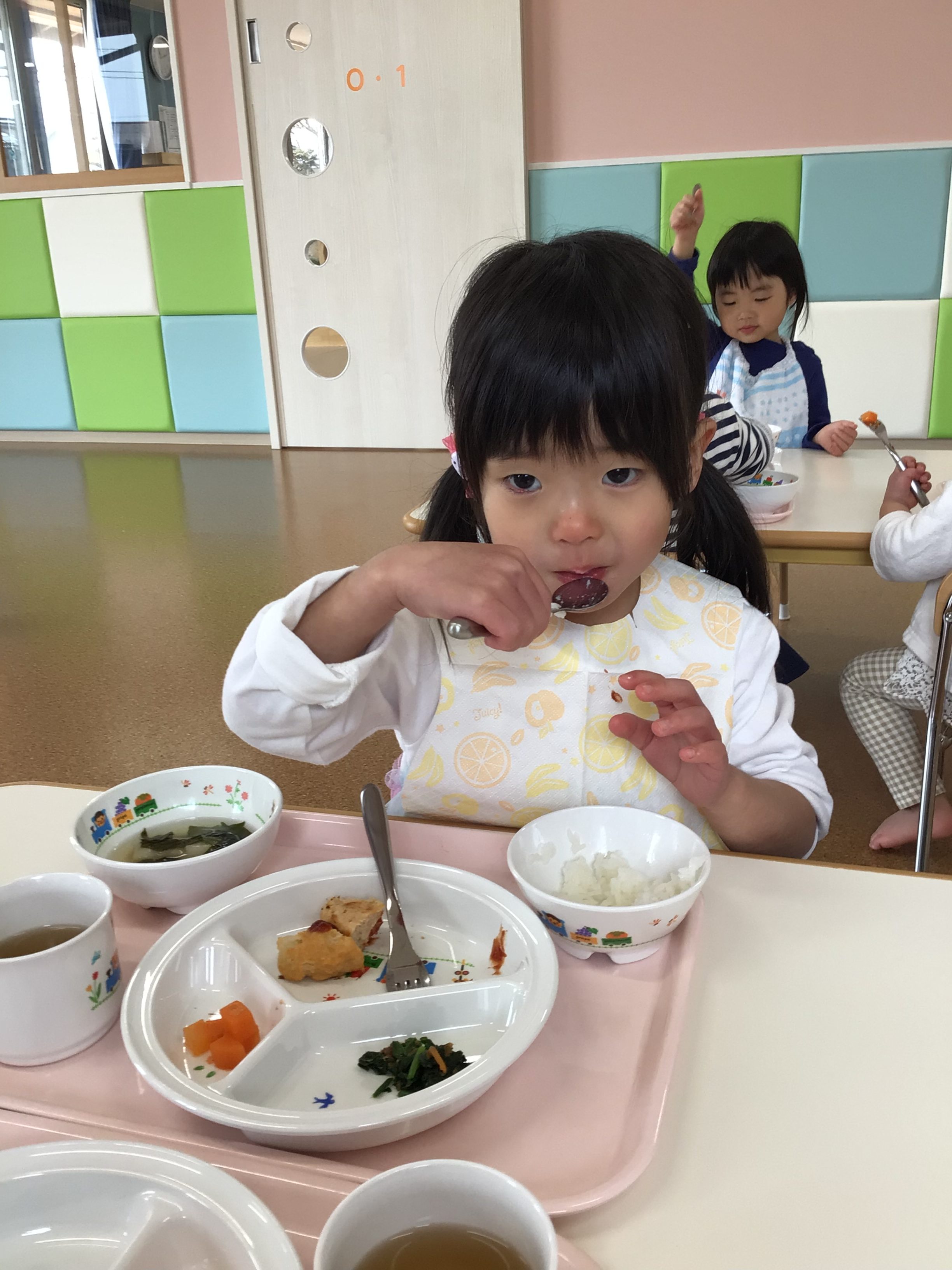 お外でたくさん遊んだ後は、保育園に戻って給食です![]()