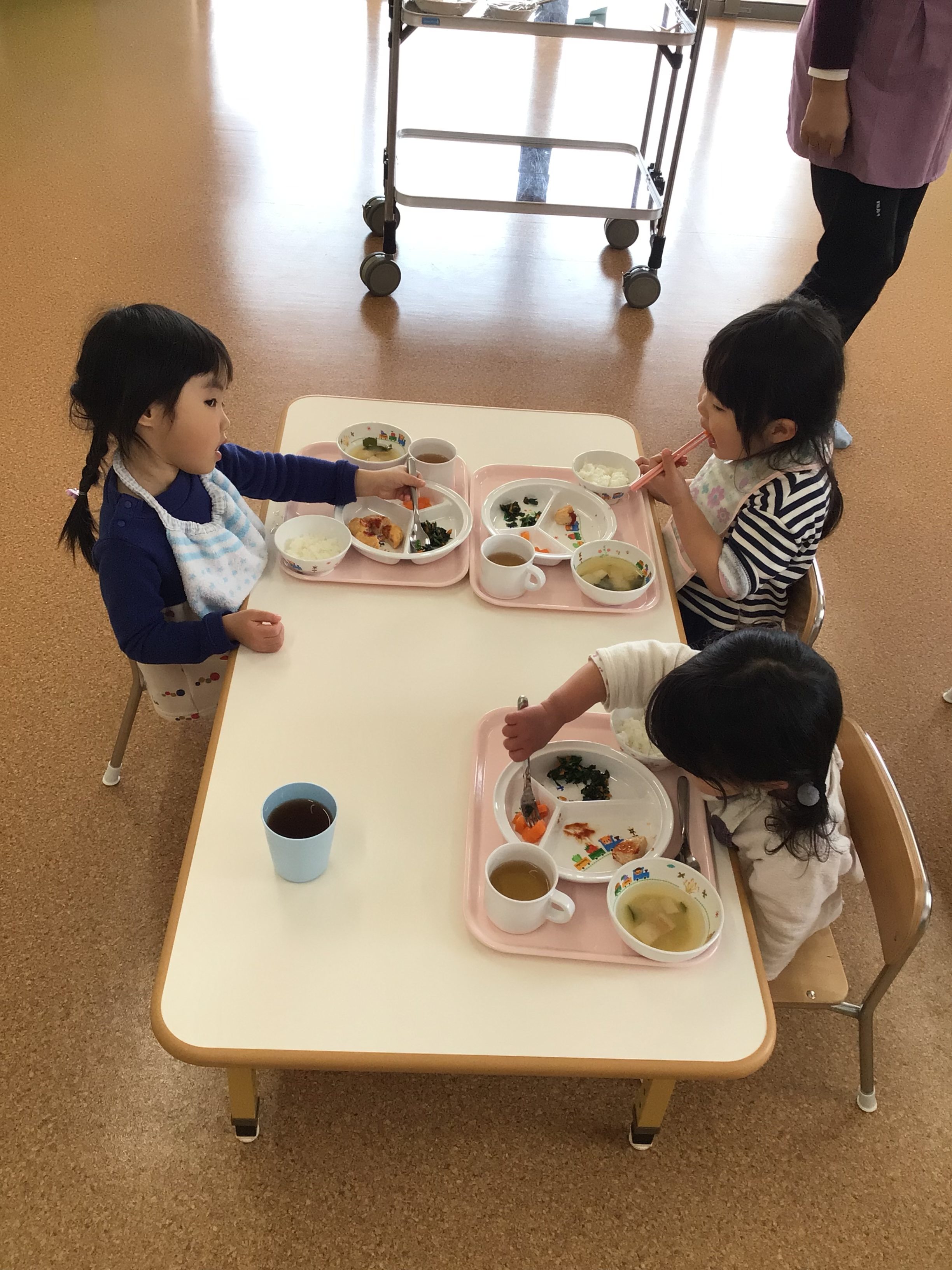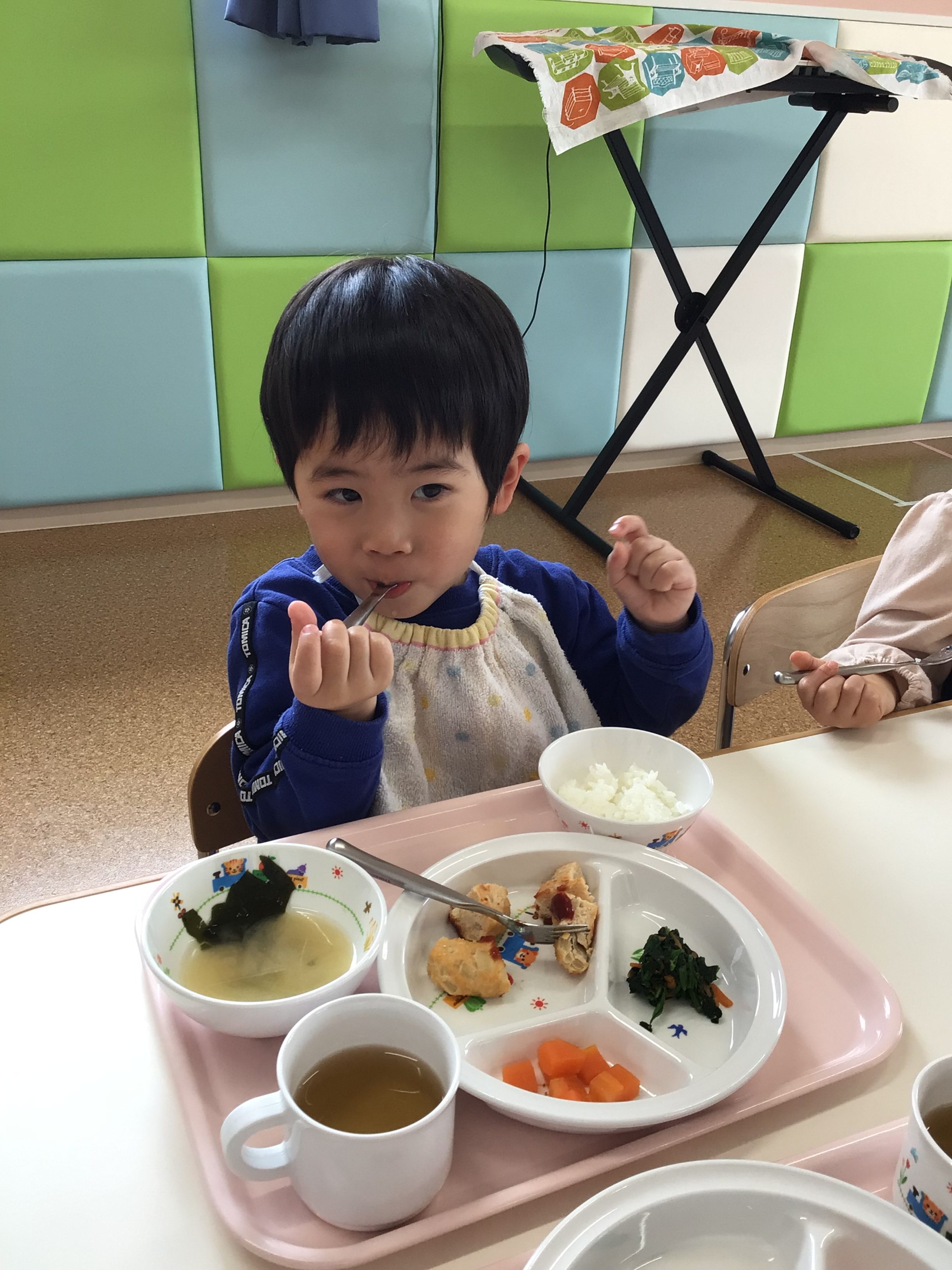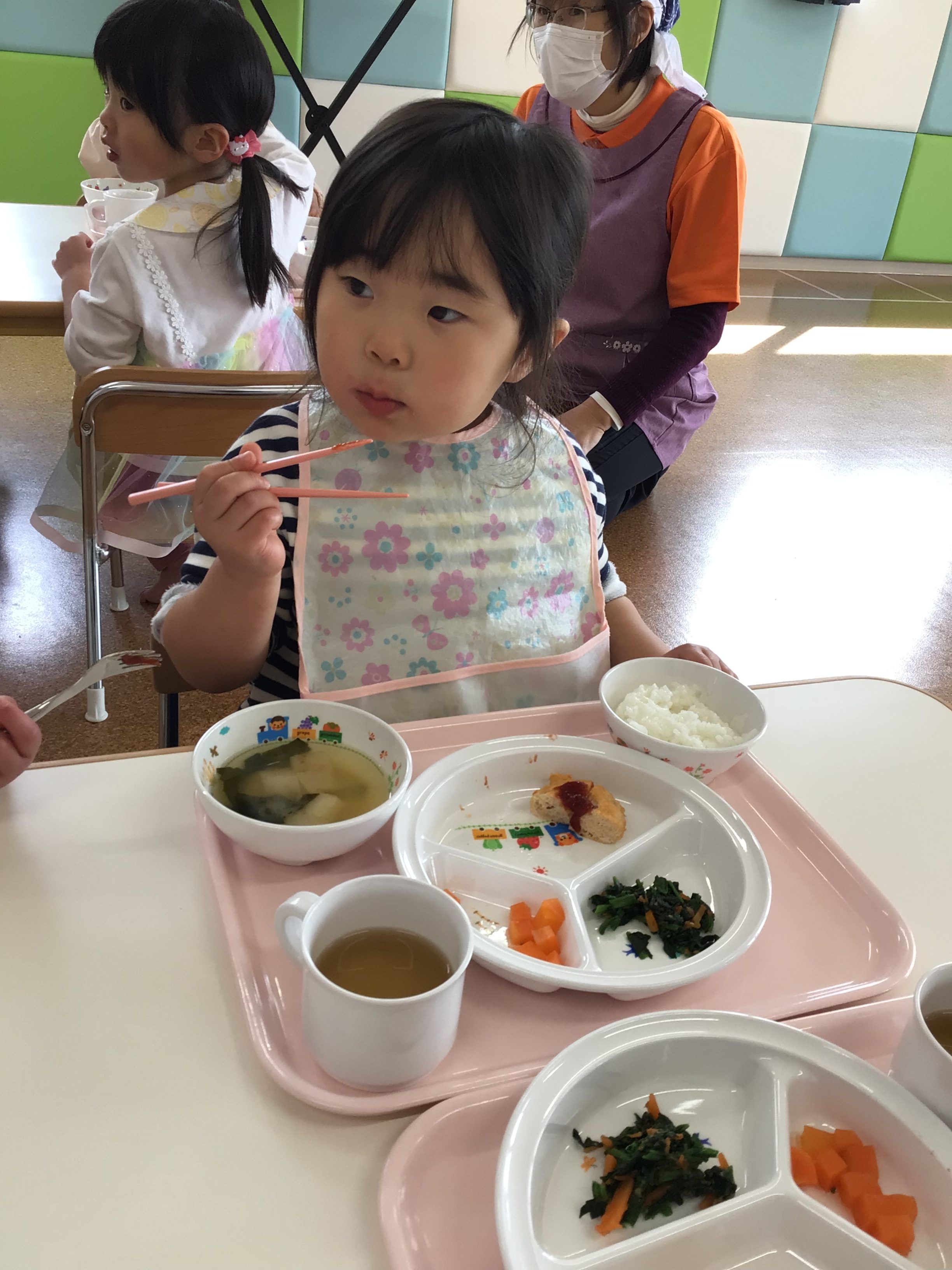 お外でたくさん遊んだ後は、保育園に戻って給食です![]()