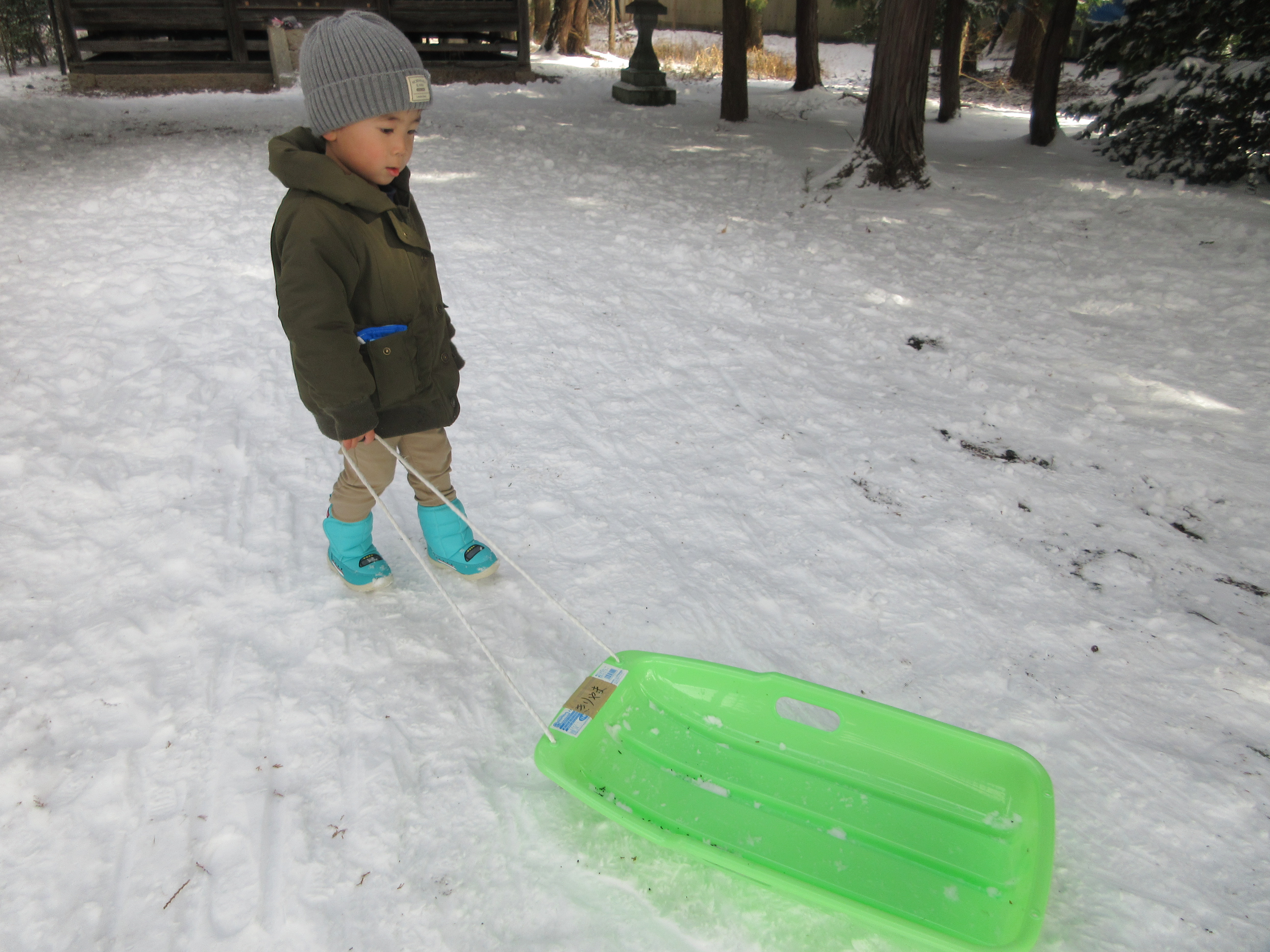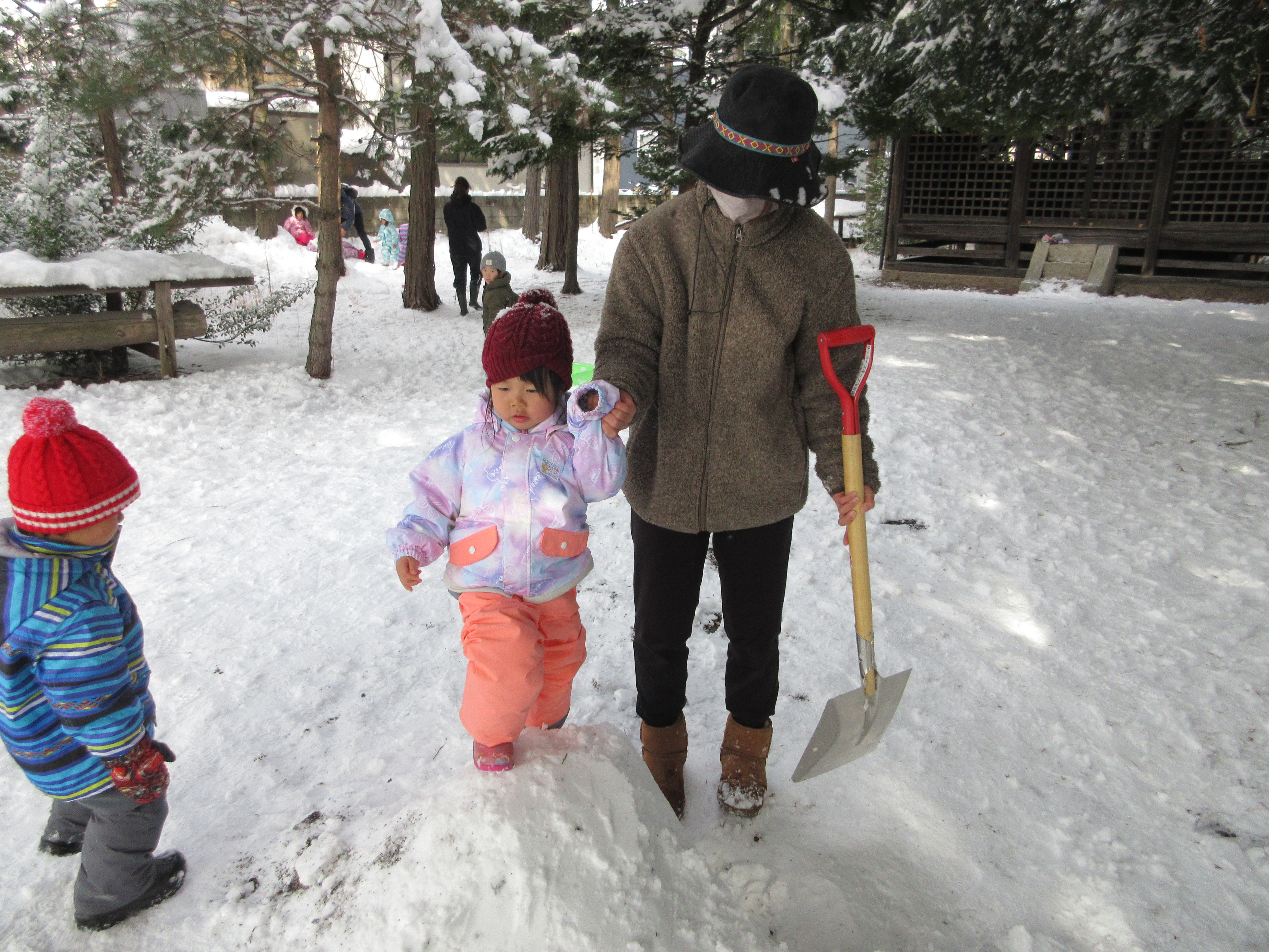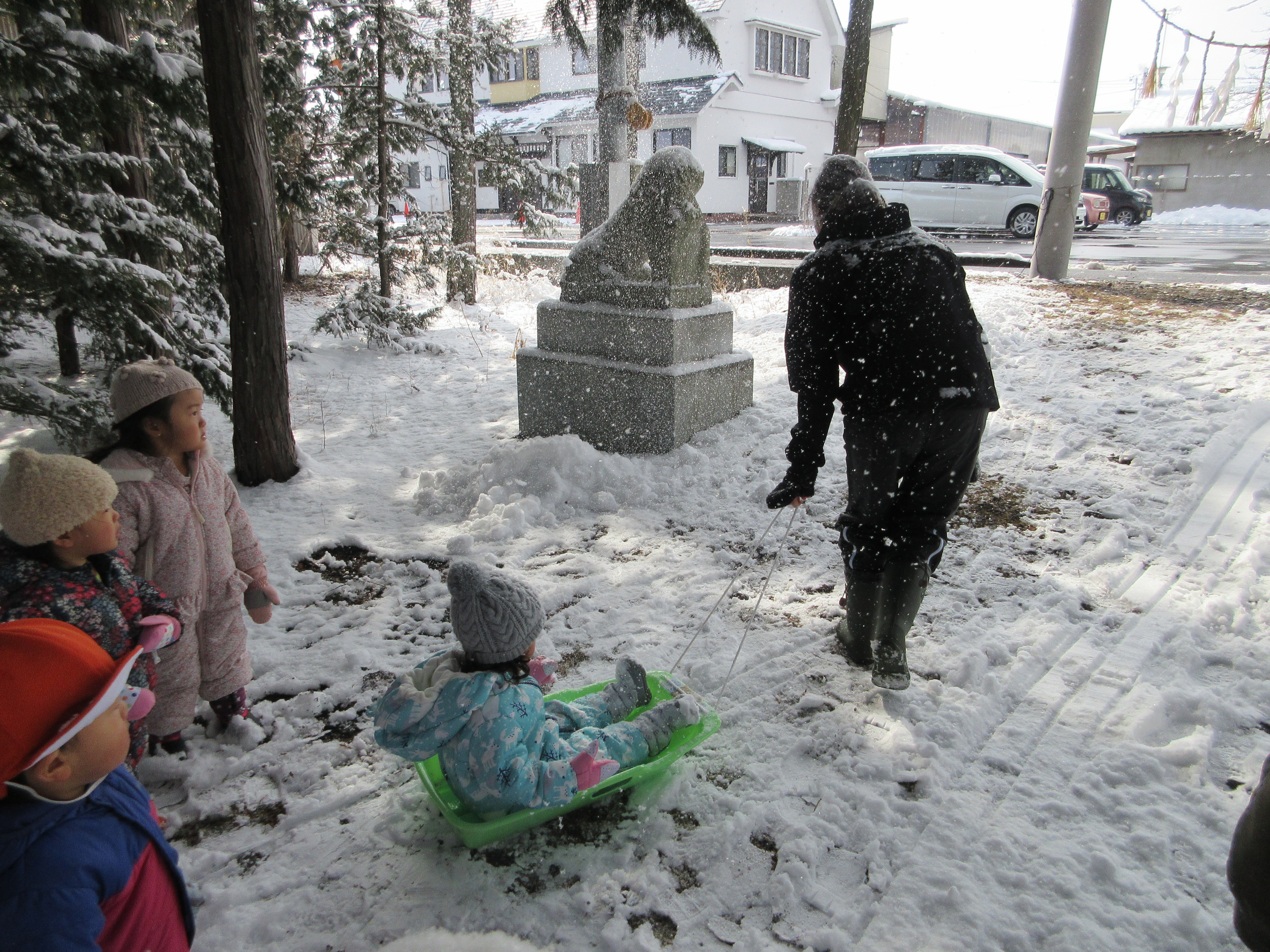 雪がたくさん積もったので、スキーウェアを着て保育園近くの神社で雪遊びを楽しみました![]()