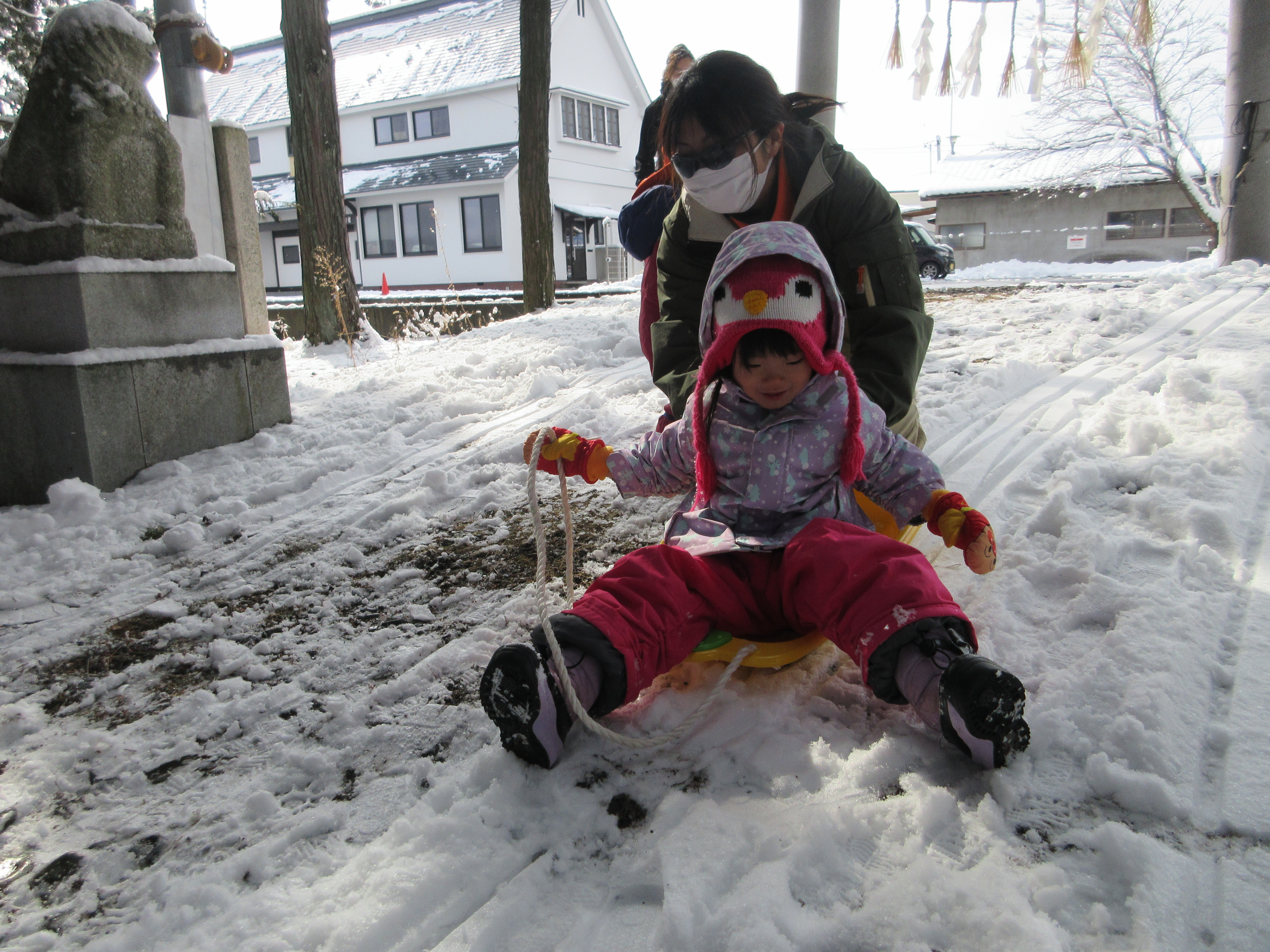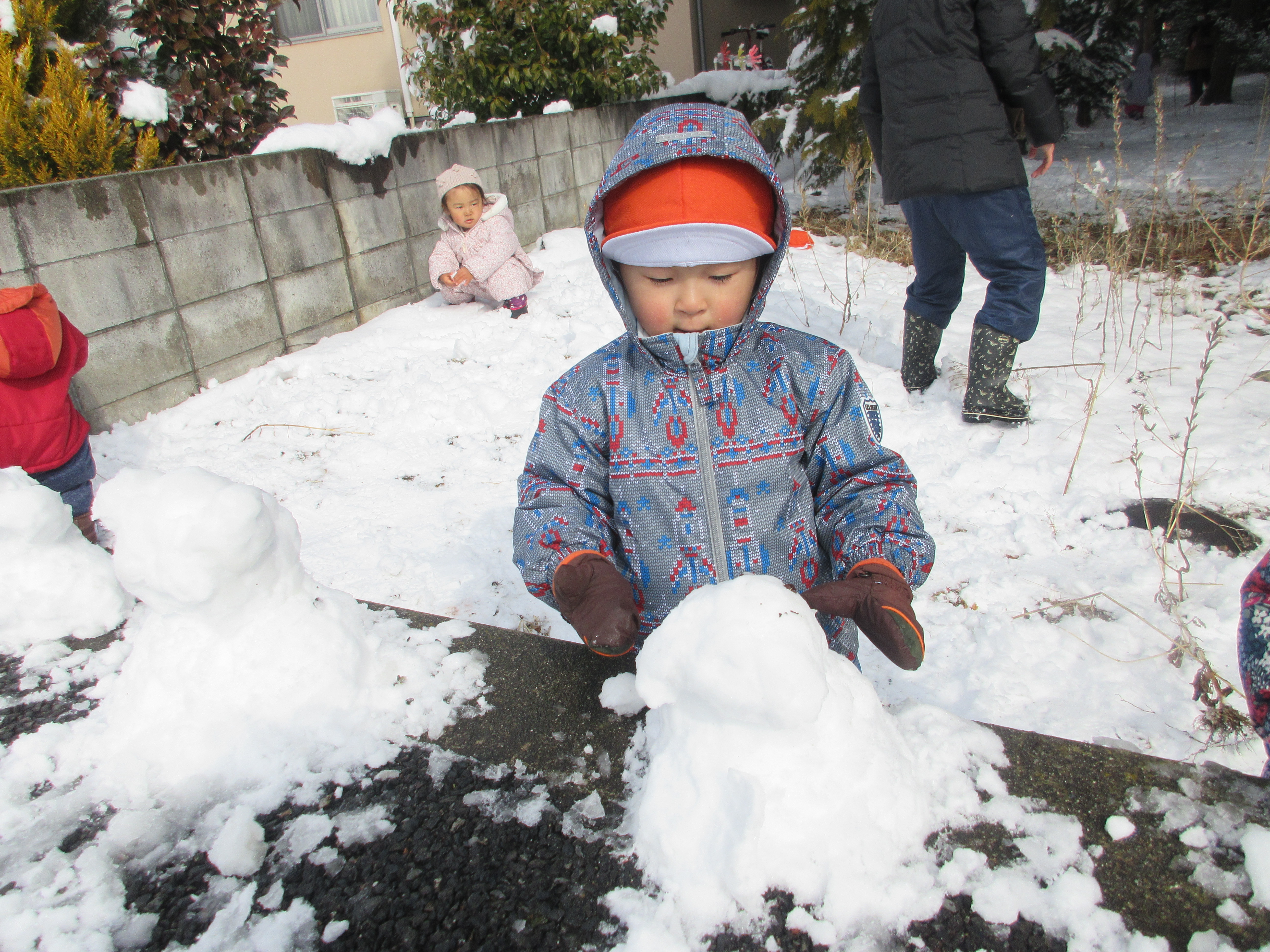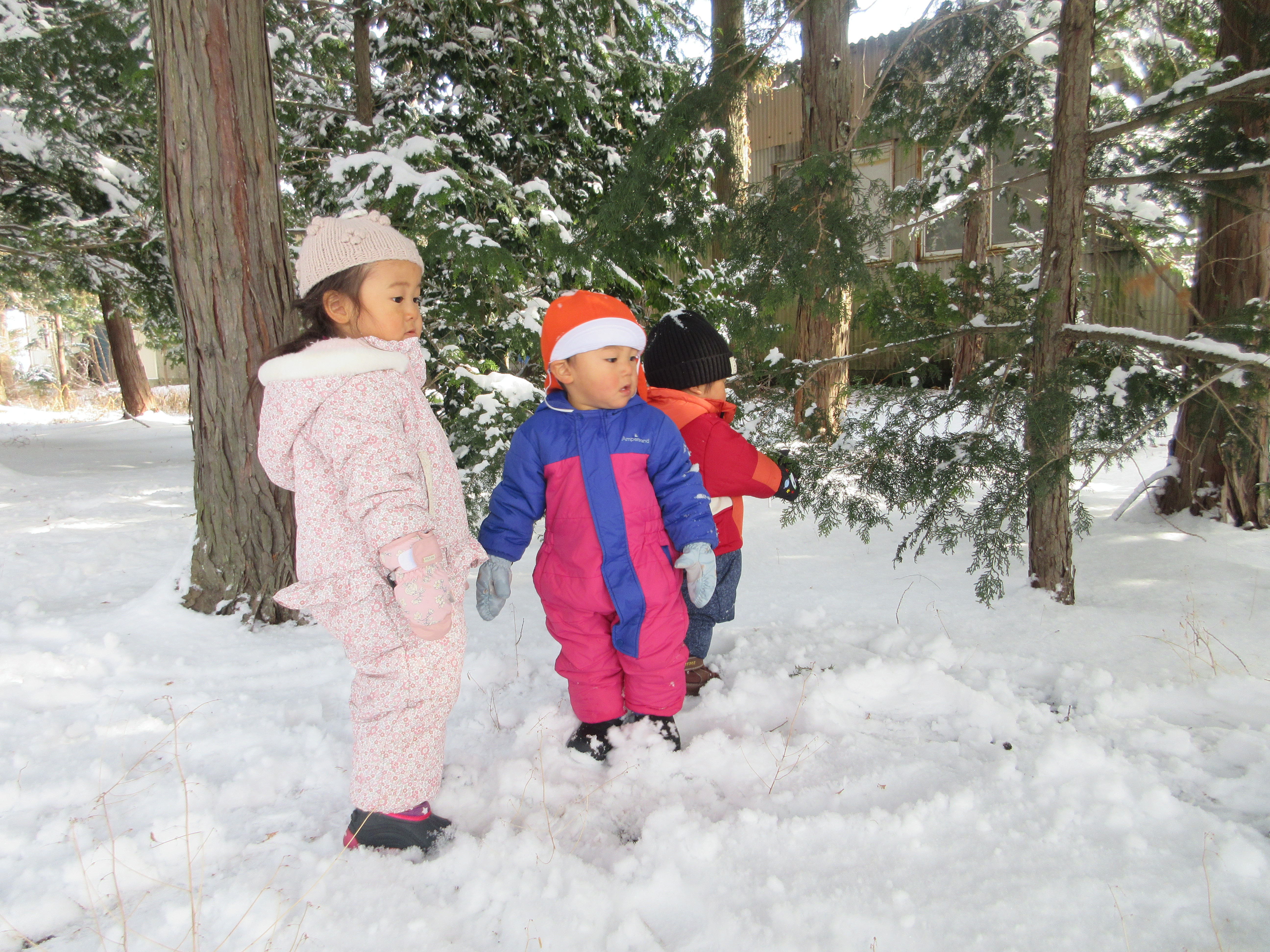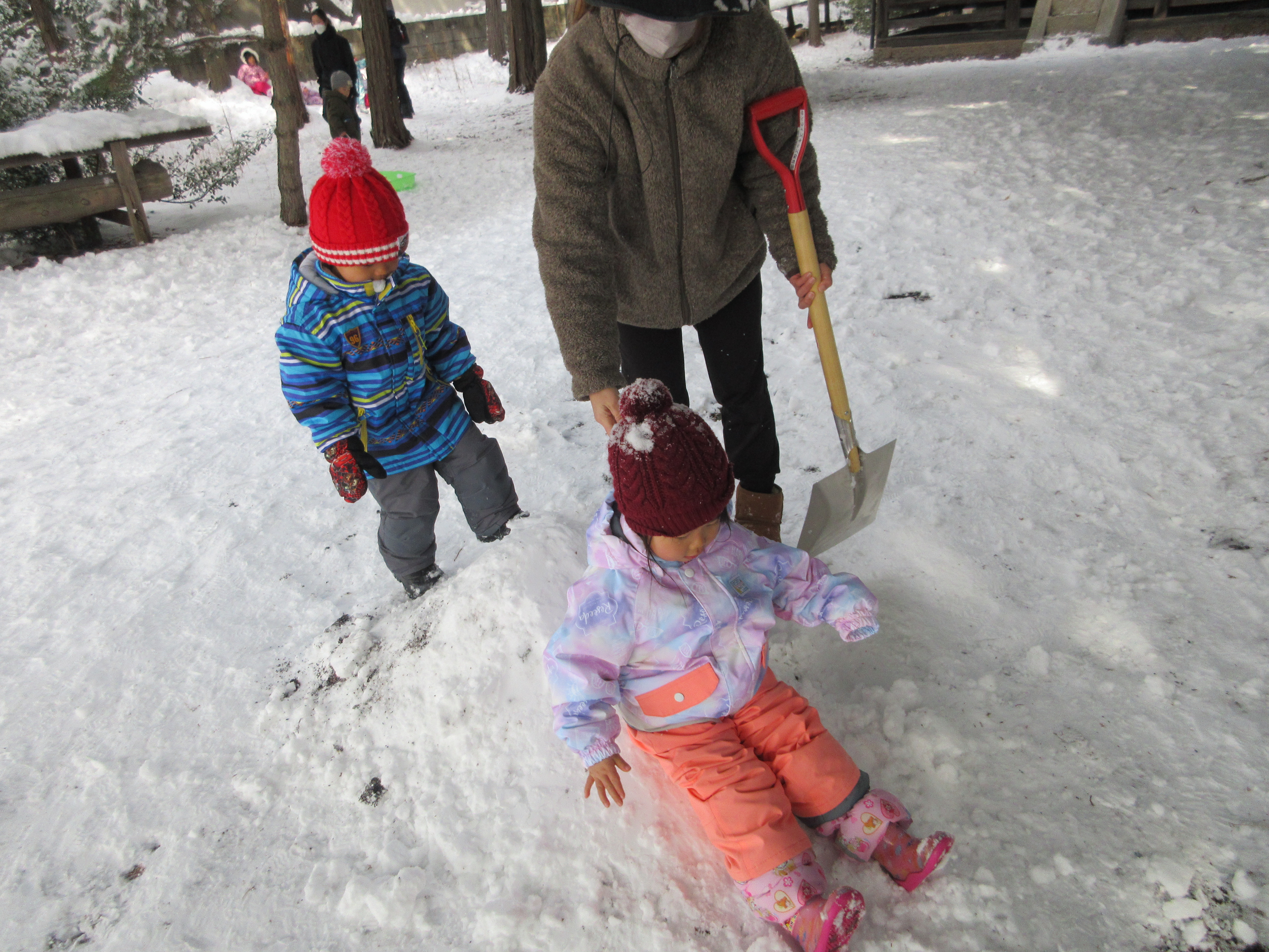 雪がたくさん積もったので、スキーウェアを着て保育園近くの神社で雪遊びを楽しみました![]()