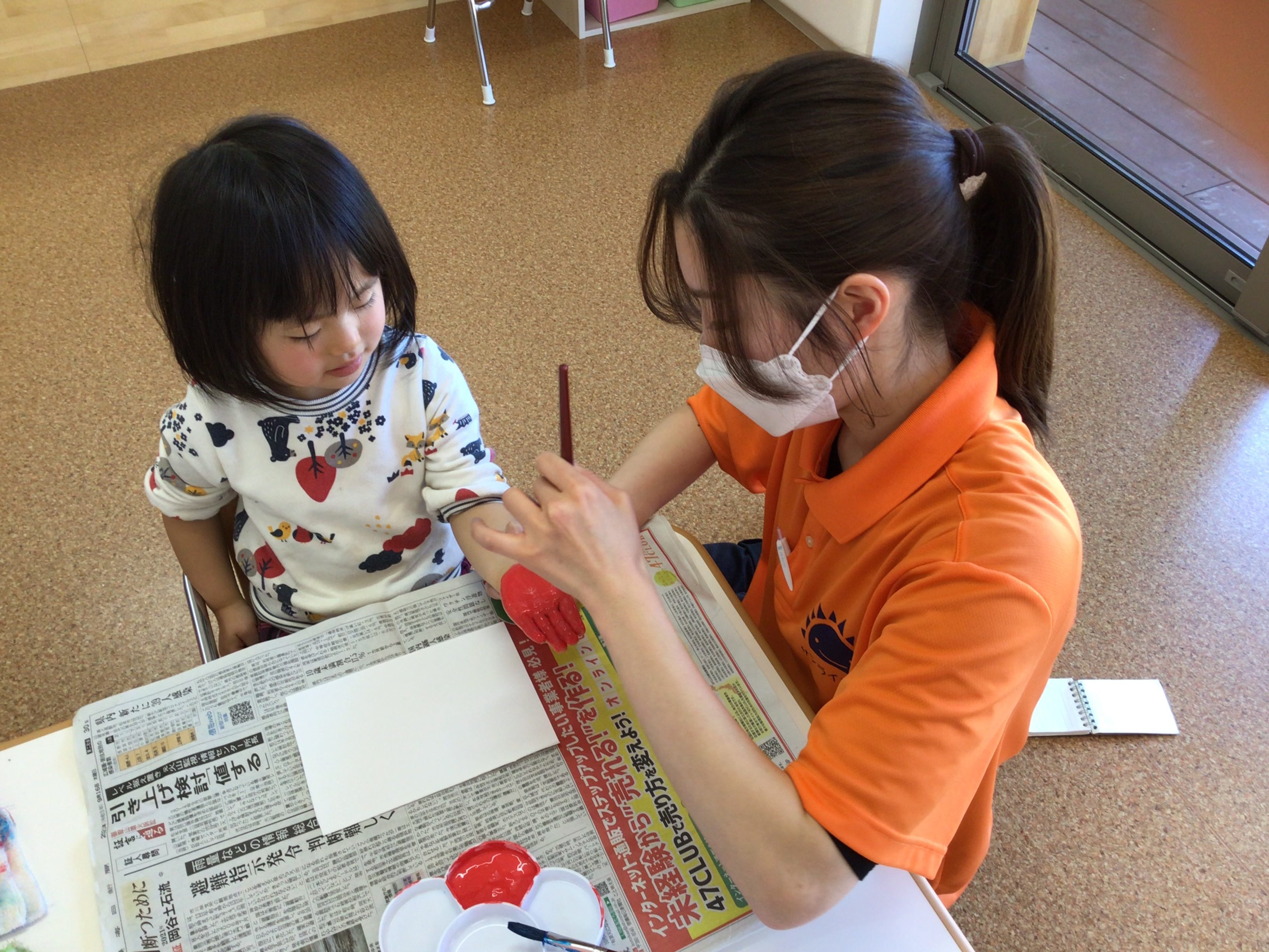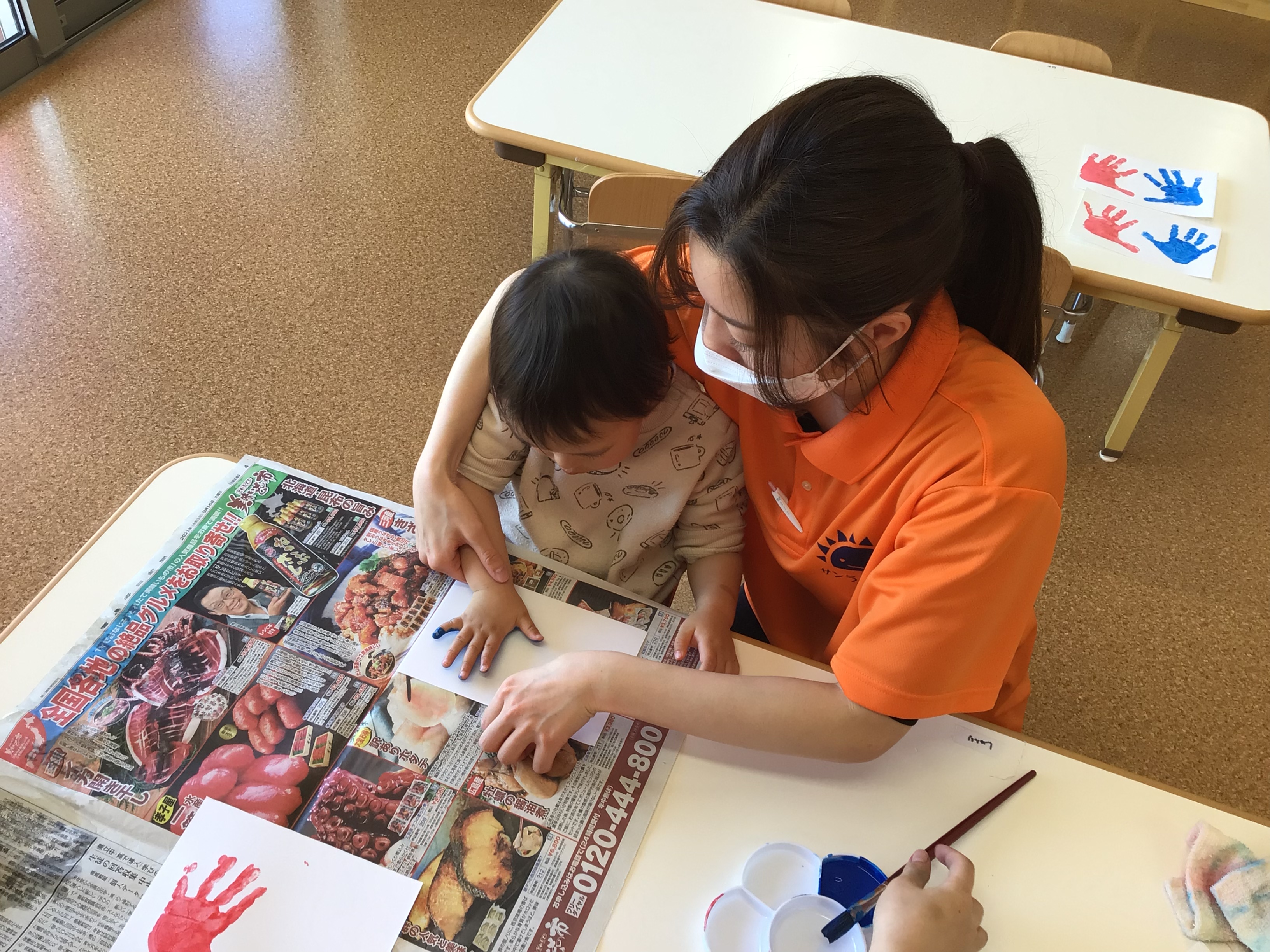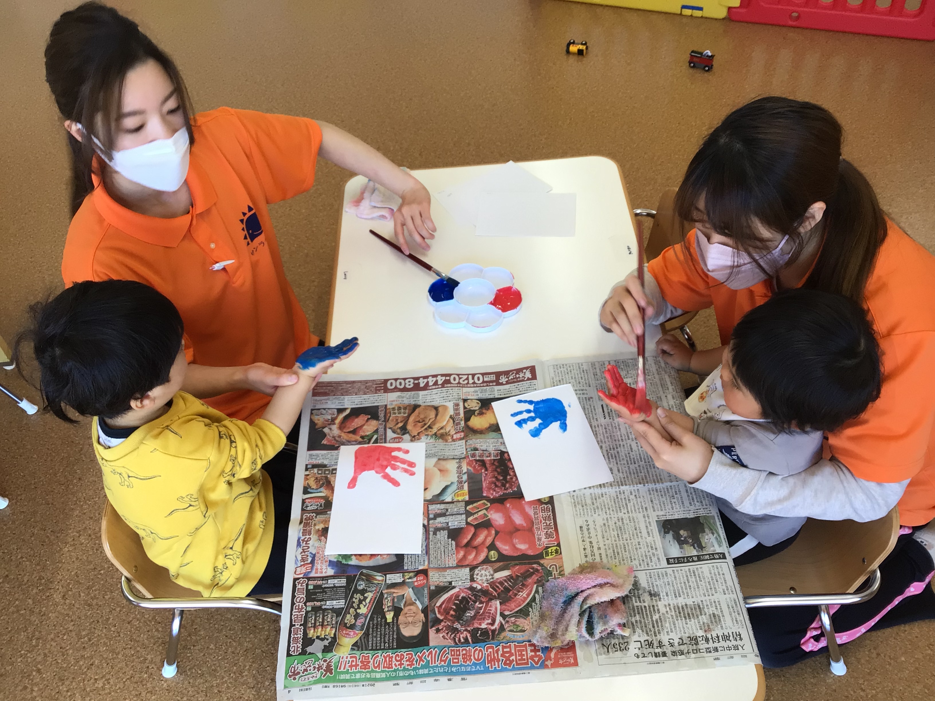 青色と赤色の絵の具を手にぬりぬりして、、、