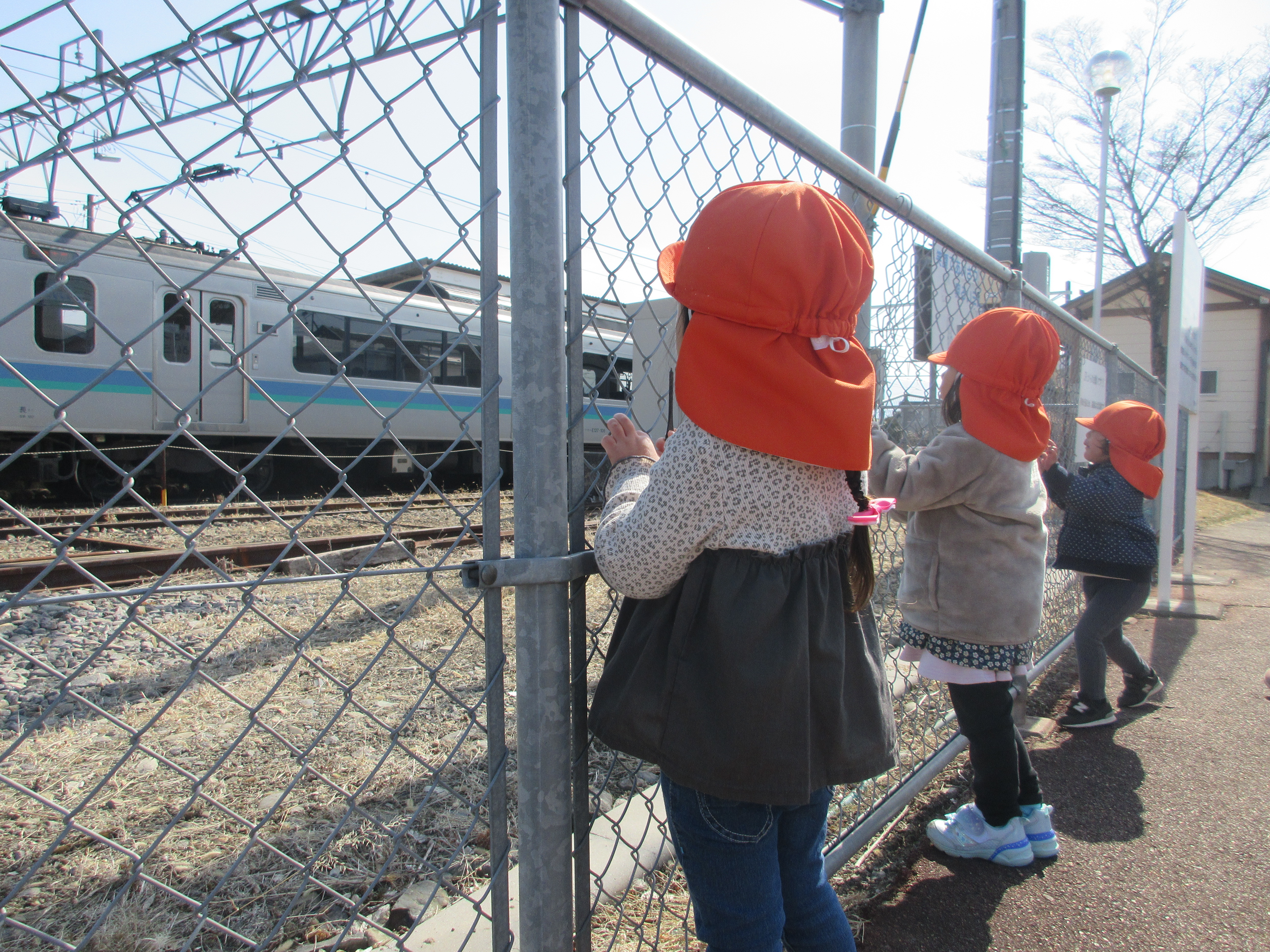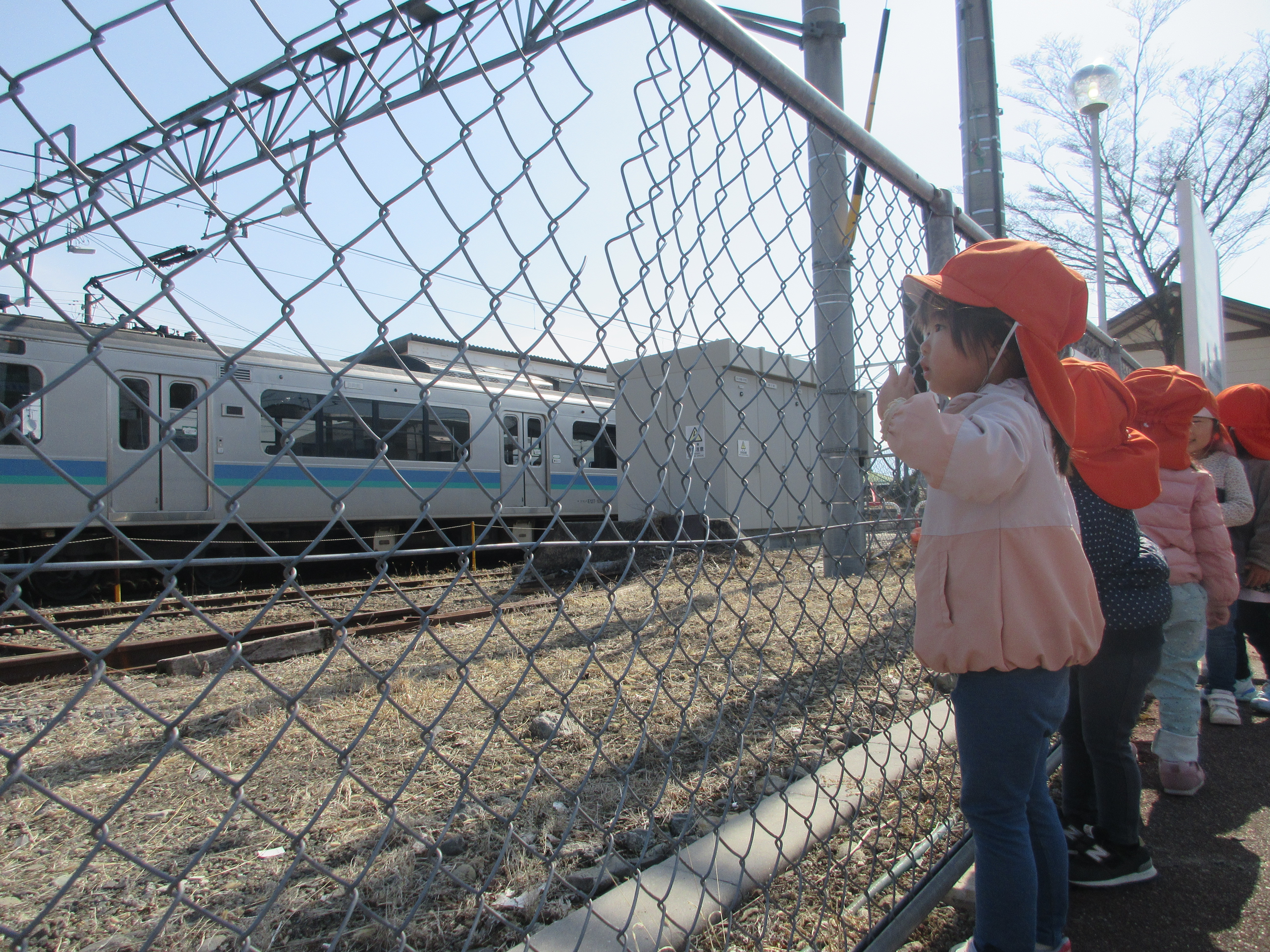 カンカンカン…と踏切の音が聞こえてくるとフェンスに張り付いて電車が来るのを待っている子どもたち![]()