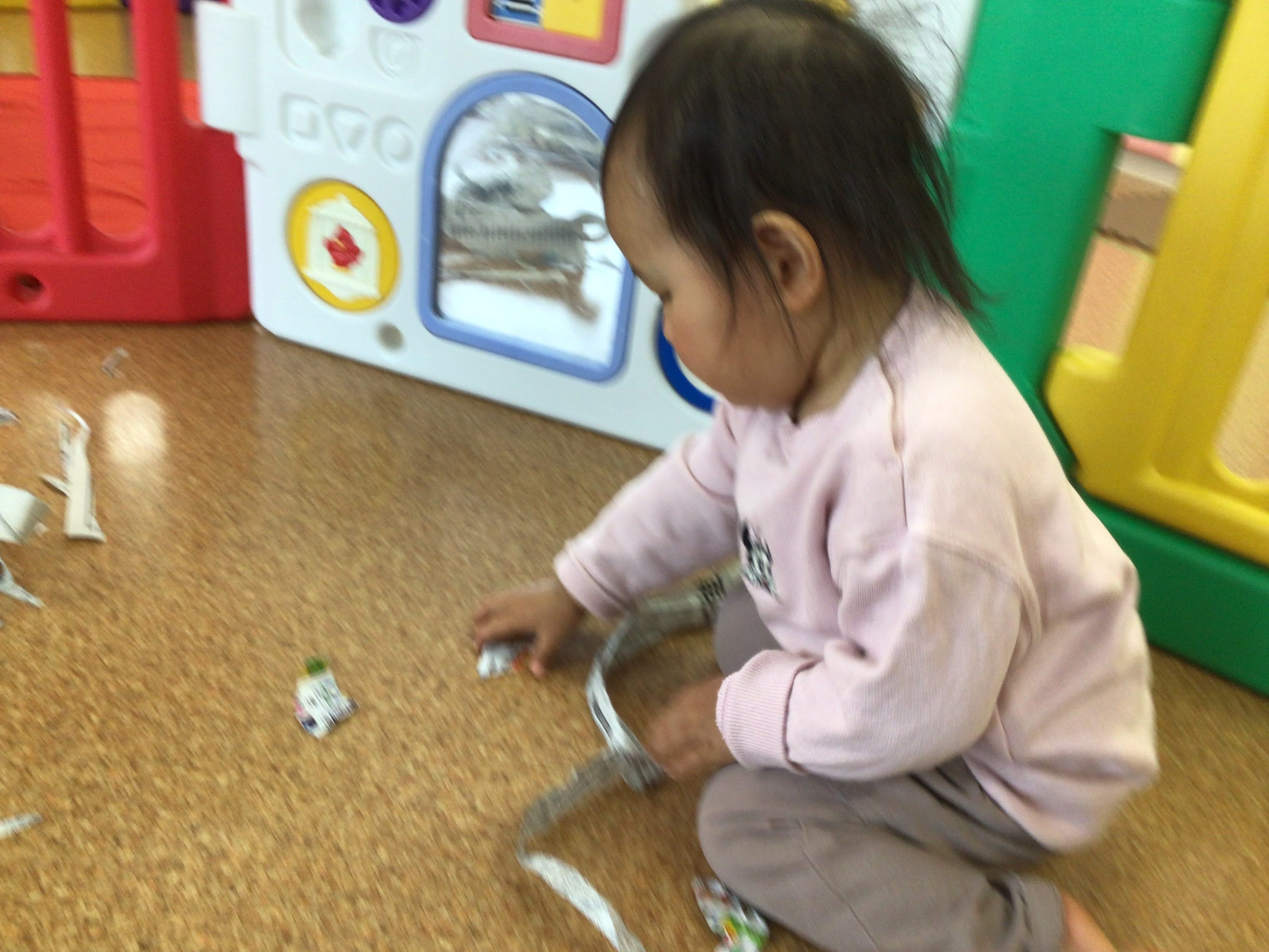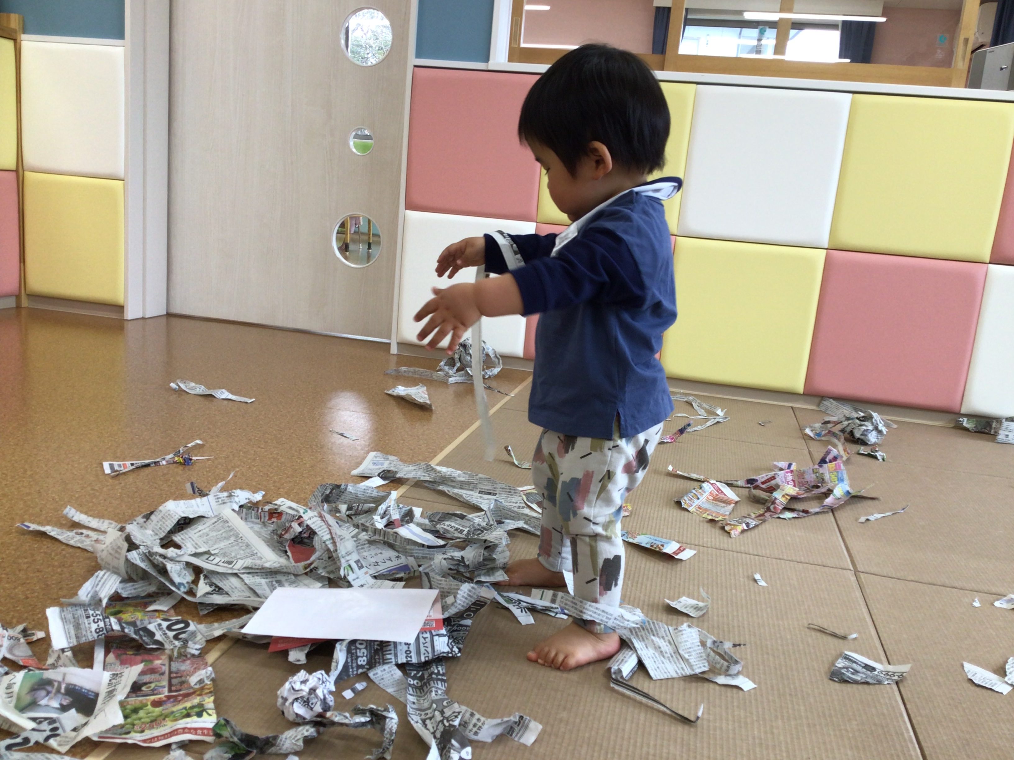 ちぎった紙を上からパラパラと落としてみると「キャー」と掴もうと手を伸ばしていました![]()