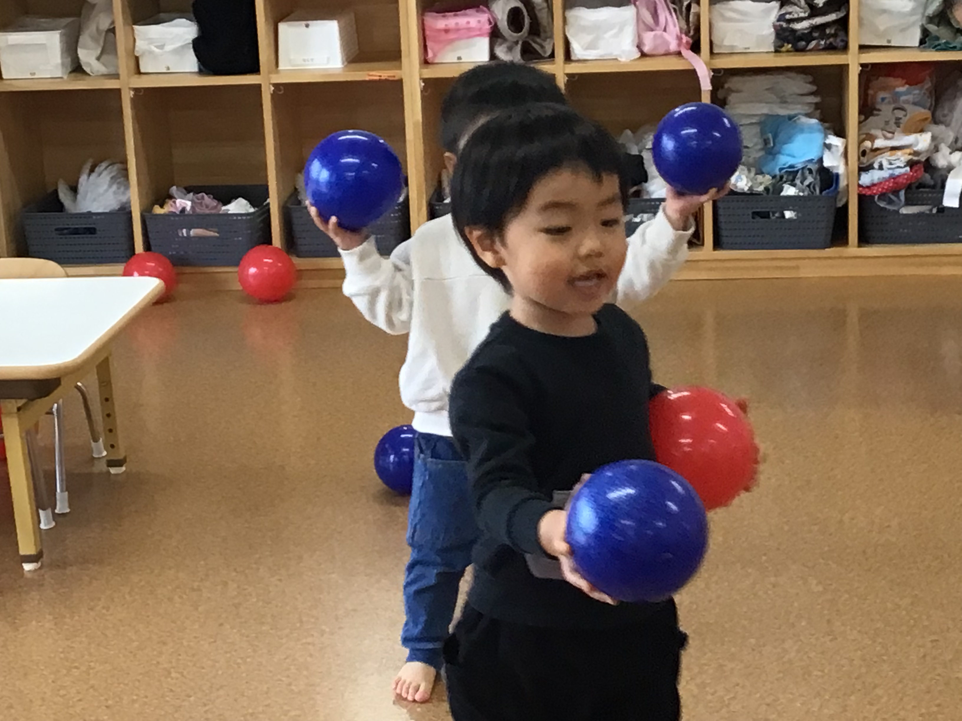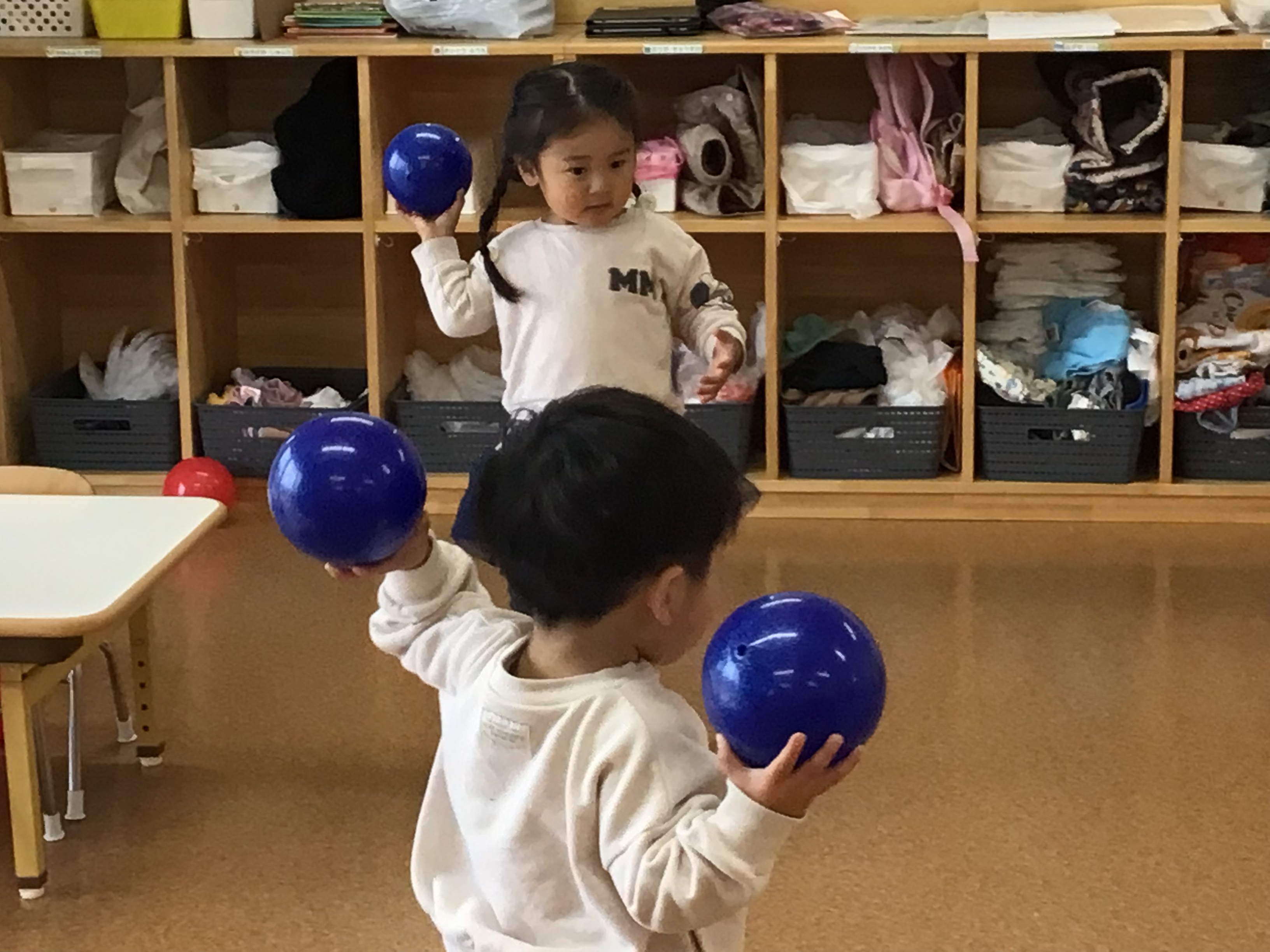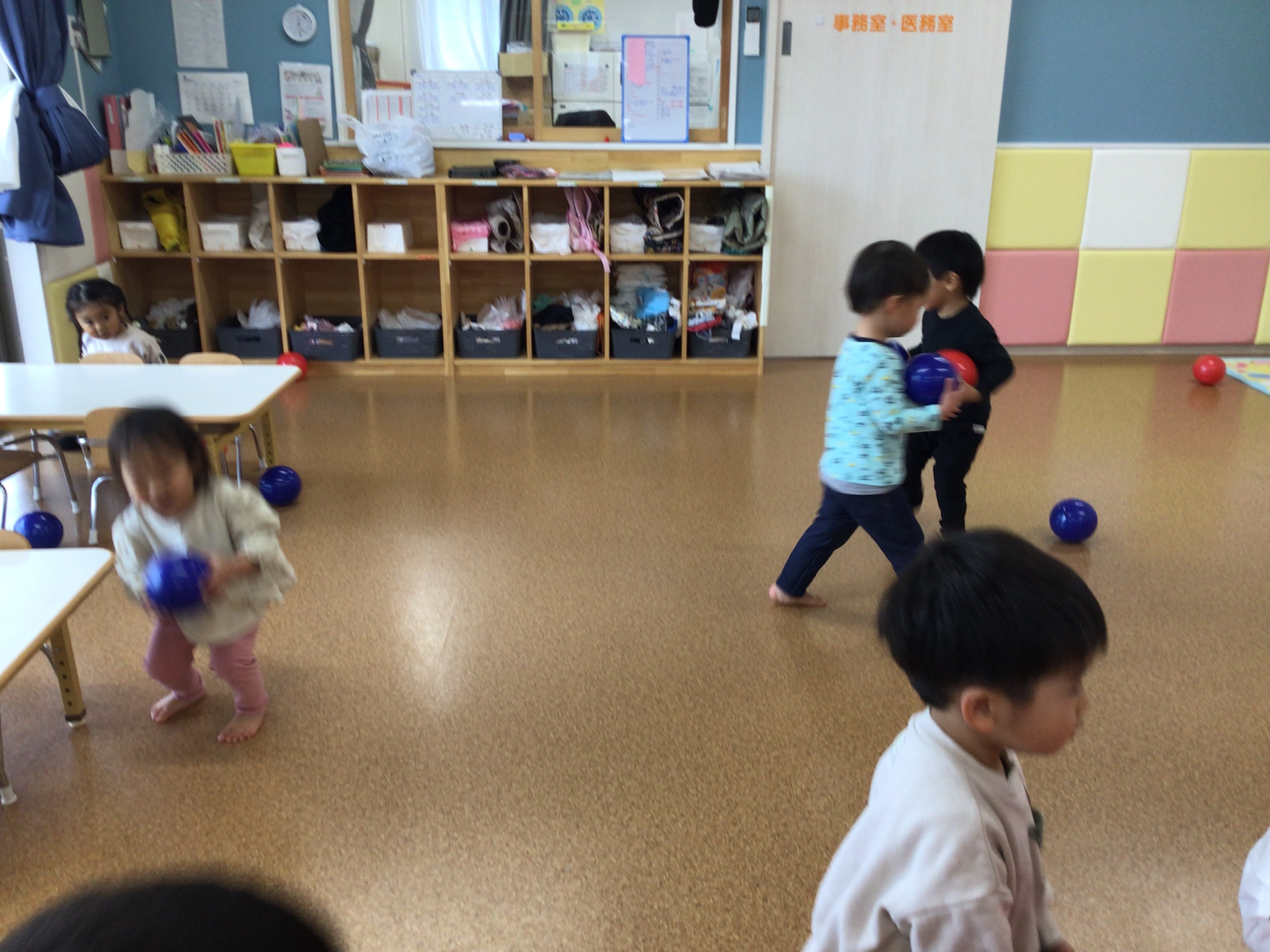 蹴ったり、滑り台の上を転がしたり、いろんな方法で楽しむ子どもたちでした![]()