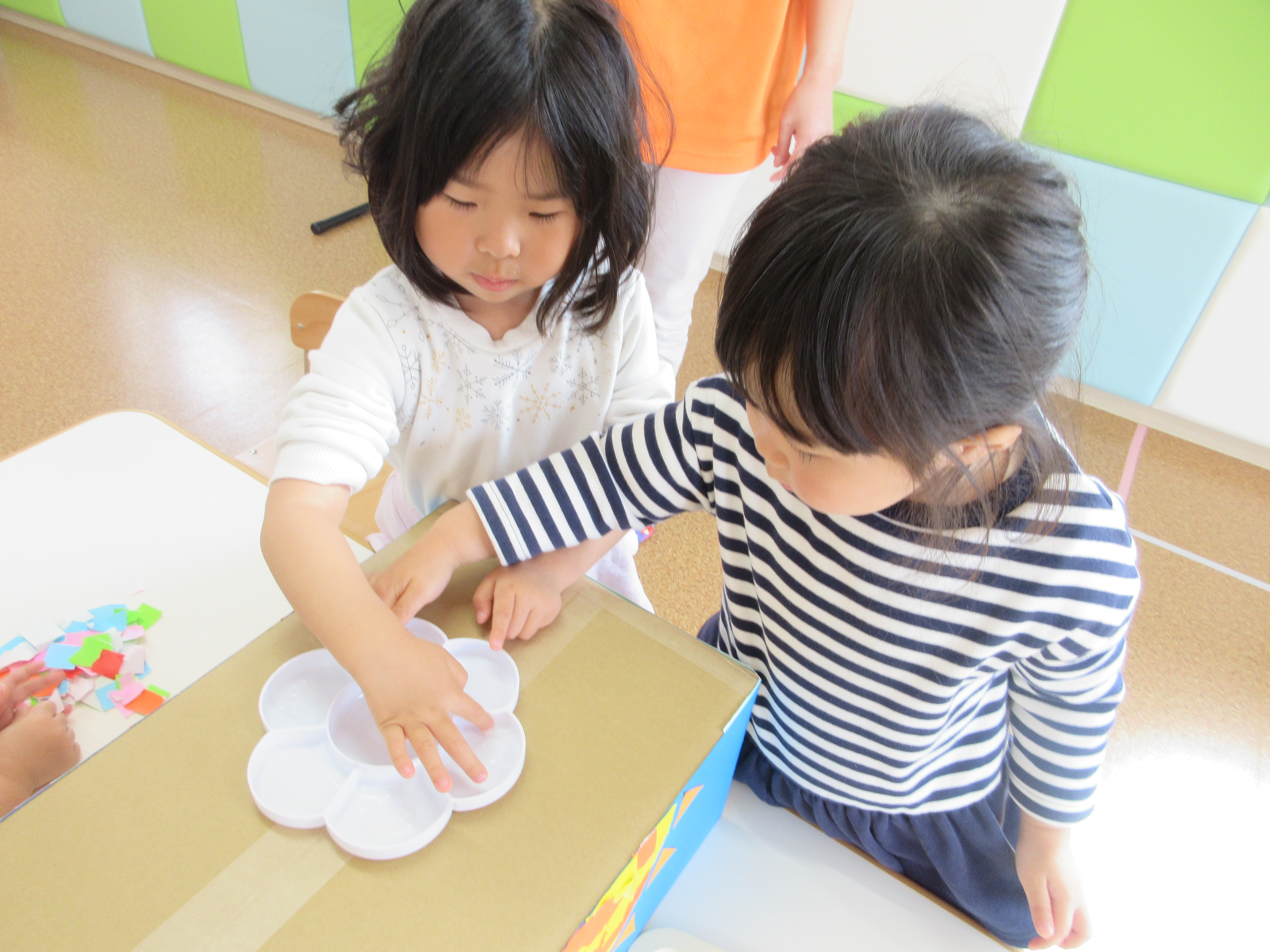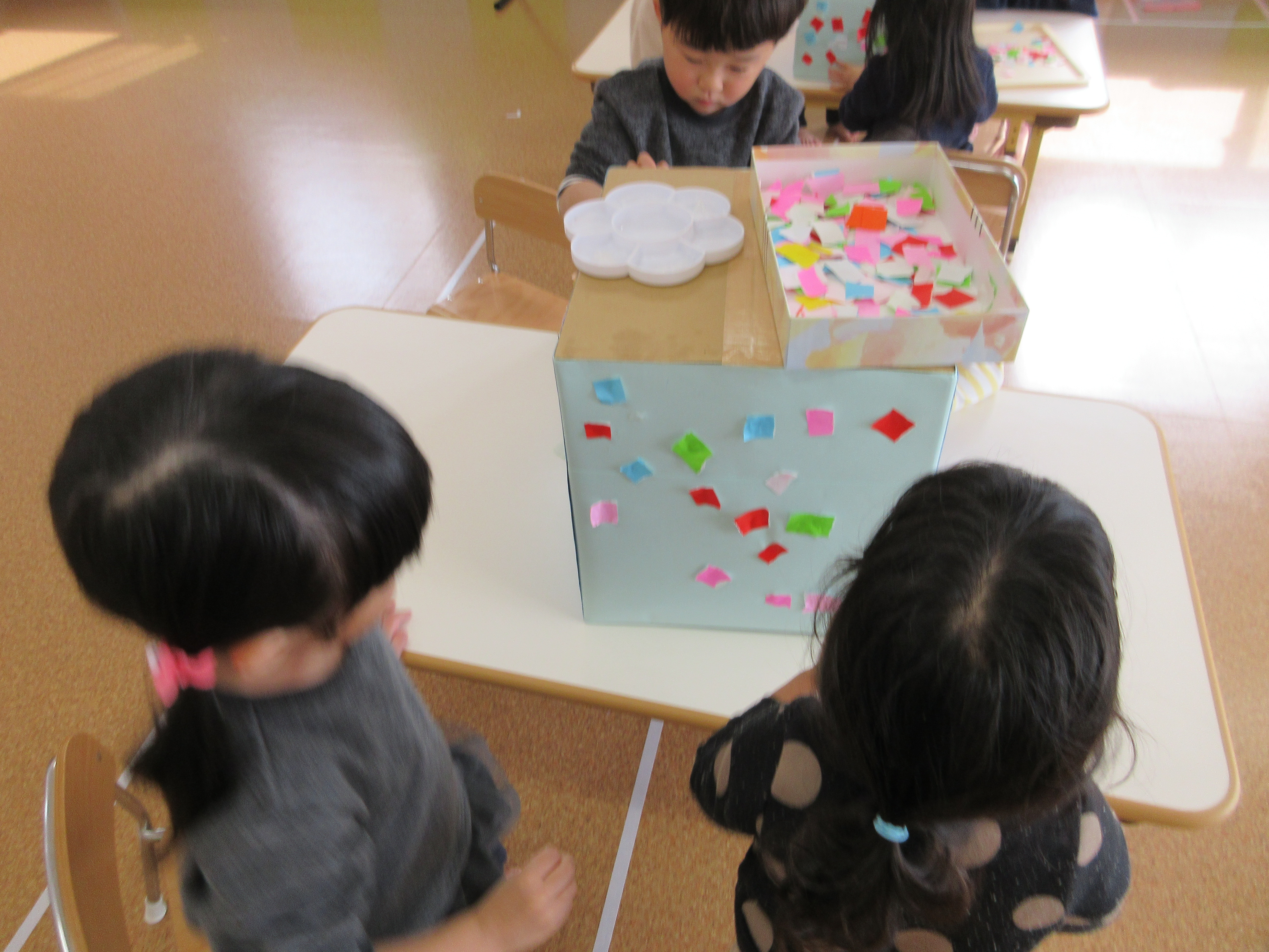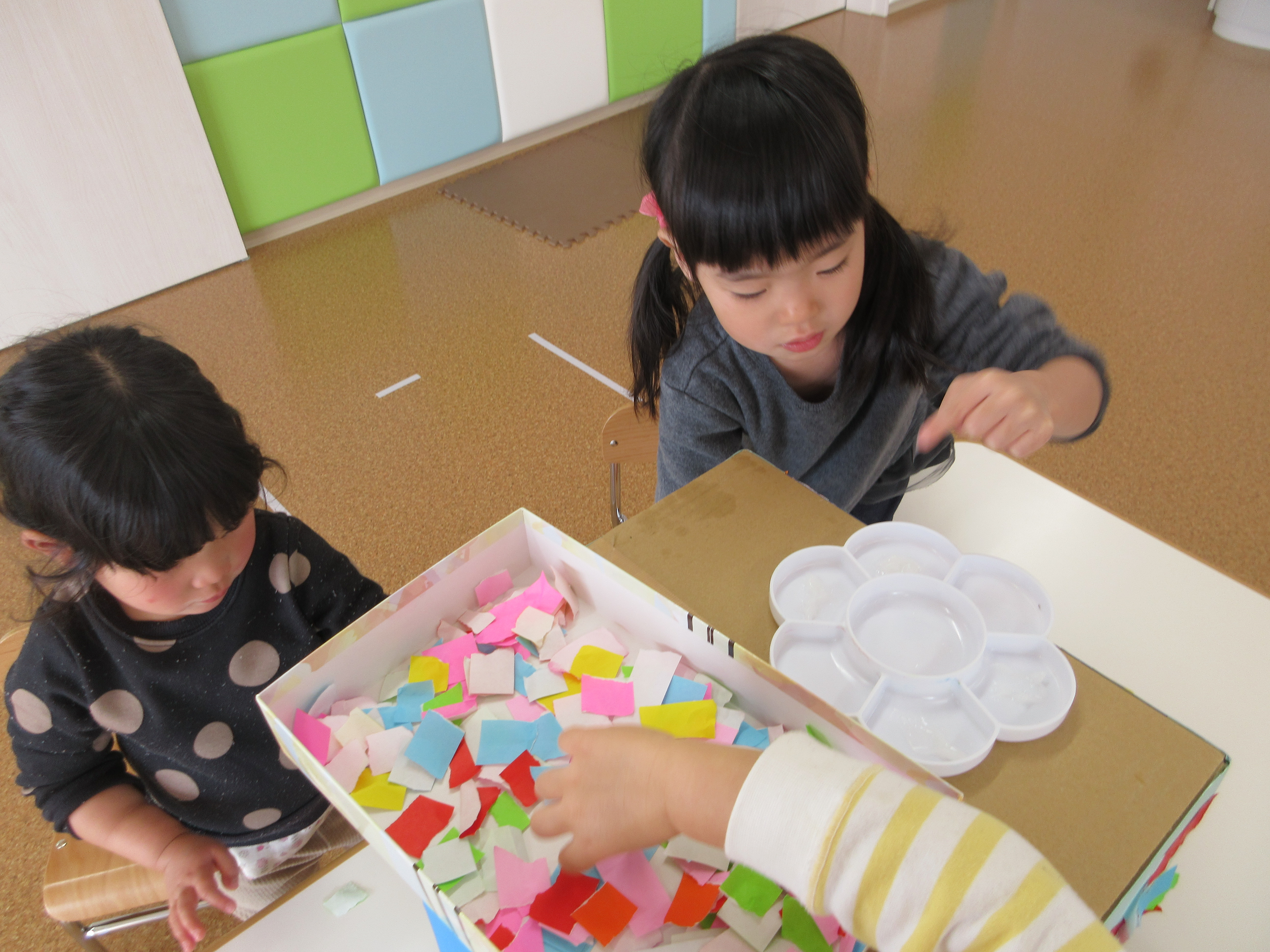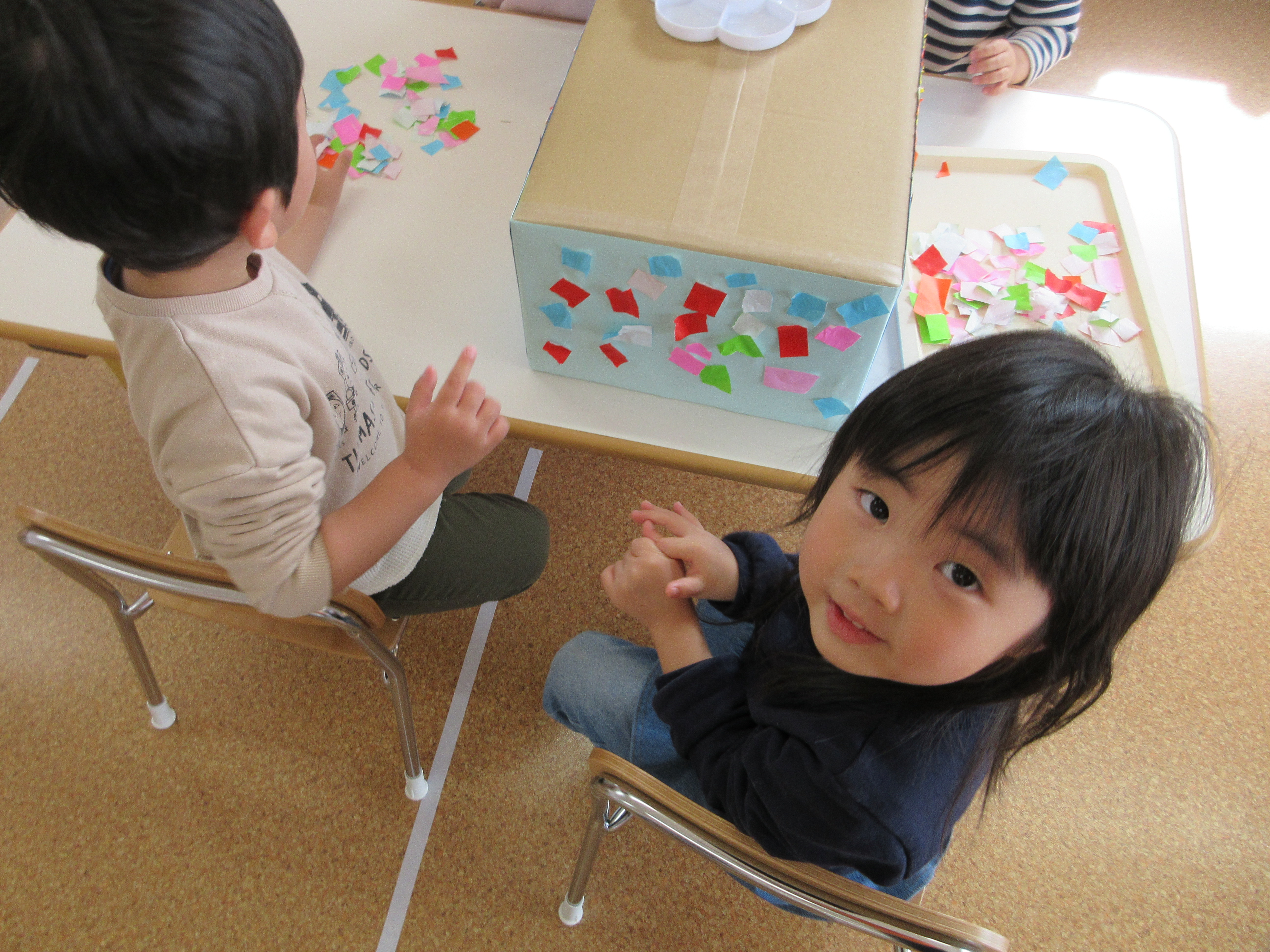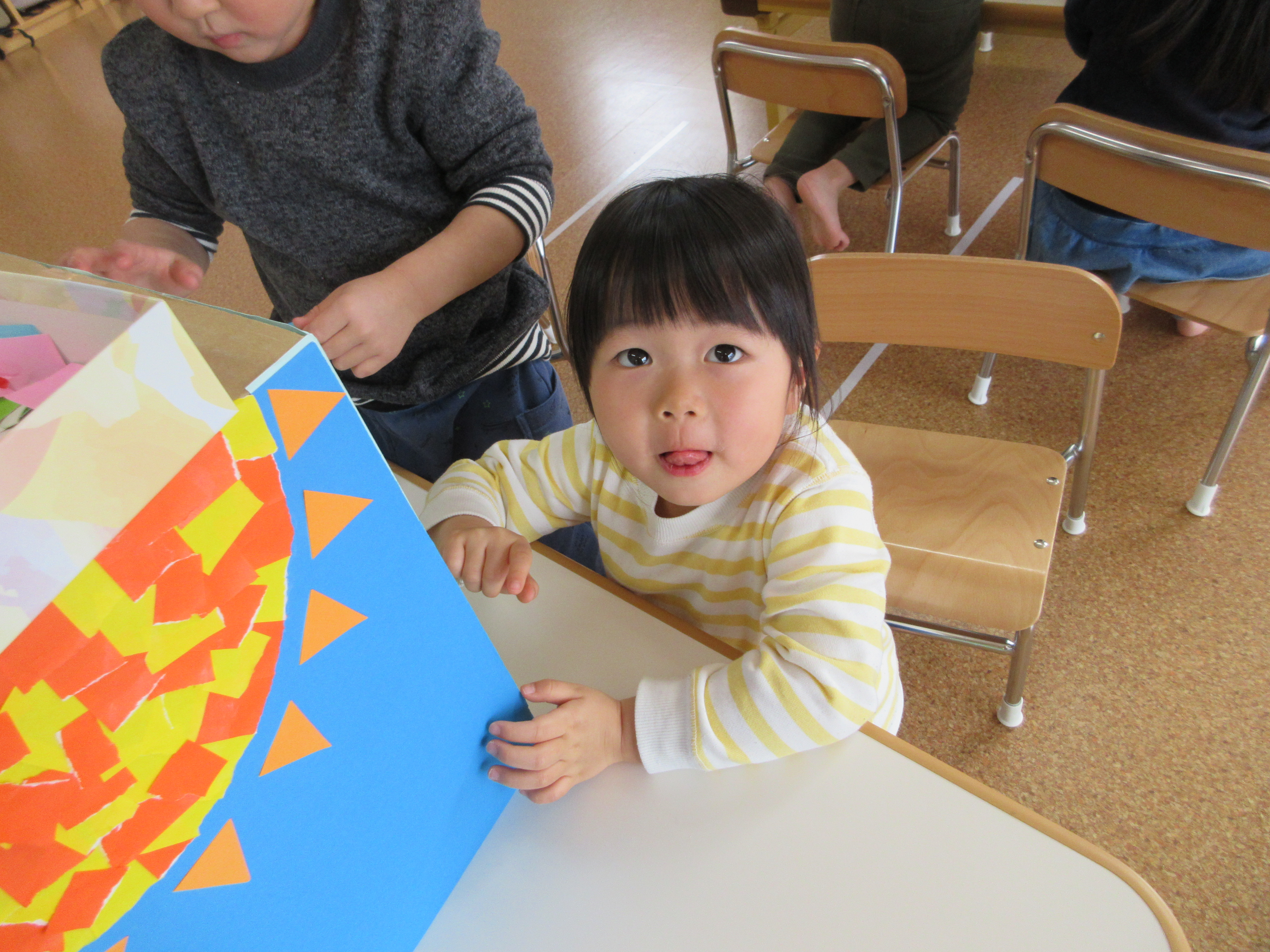 空いたところには、みんなで好きな色の折り紙を糊を使ってペタペタ![]()