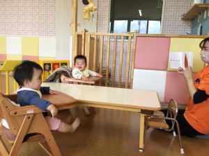 保育士が絵本の言葉に合わせて体を揺らすと、、