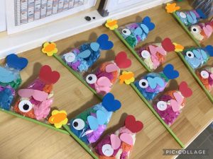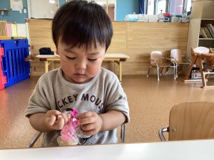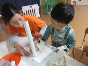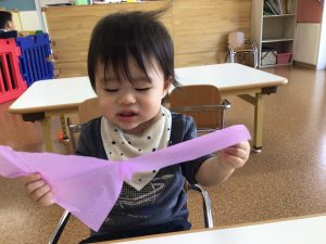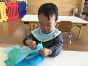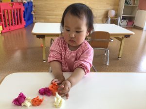 最後は保育士と一緒に透明な袋の中にお花紙を入れていきました![]()