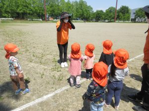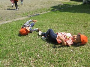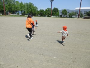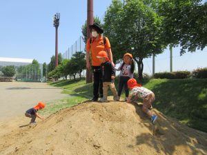 先生に追いかけられて大はしゃぎで逃げる子、坂になっている芝生の上にゴロゴロゴロ〜と上手に転がる子、小高い砂山に登って、自分の身長が高くなったような気分になり、少し得意げな表情を見せてくれる子、みんなそれぞれの遊びを見つけたり、お友達と一緒になって遊んだりと楽しみました![]()