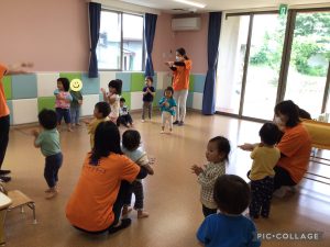 りんご組さんのお部屋に、いちご組さん、もも組さんも集まり合同で行いました![]()
