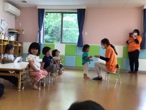 椅子に座って待っているりんご組さん。先生に一人一人お名前を呼ばれると、先生の所まで行き「Here you are」とフラッシュカードを受け取ります。よーく耳を澄ませて聞いていると、りんご組さんはみんな「Thank you