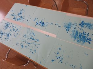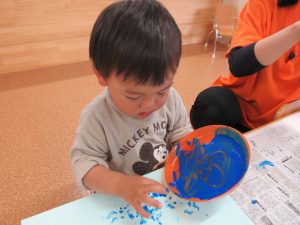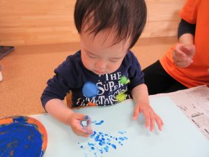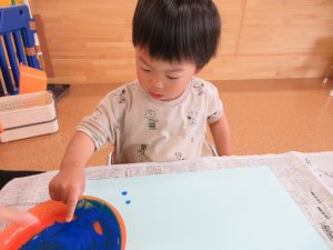 青い絵の具に初めは少し不安な表情を浮かべていたいちご組の子どもたちでしたが、慣れてくると感触を楽しみながらダイナミックに雨を表現していました![]()