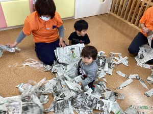 新聞紙はビリビリ破いたりくしゃくしゃ丸めたり、感触を楽しみながら保育士やお友だちと一緒に楽しめました✨