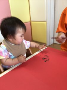 赤い画用紙に黒いてんてん。どんなものが出来上がるのでしょう![]()