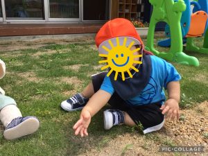 保育士が芝生に水をあげていると興味を持ったももぐみのお友だち?![]()