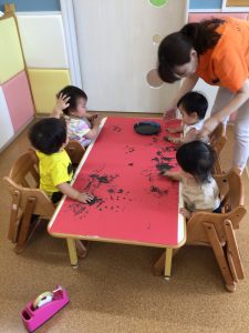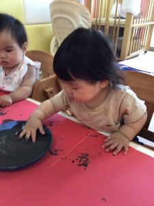 はじめは何とも言えない絵の具の感触に恐る恐る触っていたももぐみさんですが、慣れてくるとどんどんダイナミックに![]()