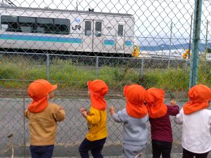 電車に「お〜〜い!!」と元気よく手を振り、お客さんが振り返してくれるとぴょんぴょん飛び跳ね嬉しそうにしていました![]()