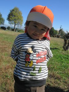 お洋服にくっつく葉っぱを保育士に付けてもらい、嬉しそうないちごぐみのお友だち💓