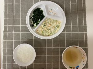 粥 味噌汁(玉ねぎ) 豆腐と野菜のだし煮 ほうれん草の煮びたし