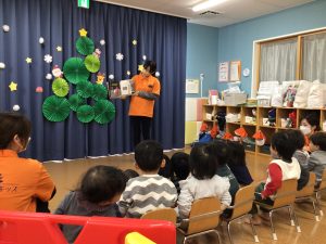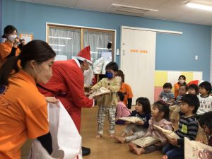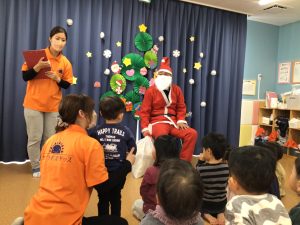 英語を話すサンタさんの代わりに保育士が通訳して答えました。