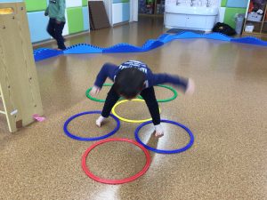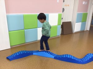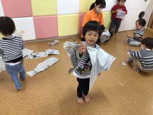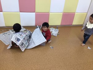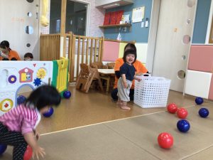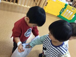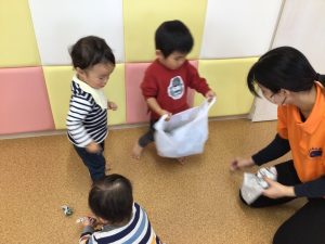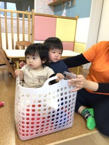 カゴにも興味を持っていたので、保育士が見守りながらバスごっこ🚌🎶