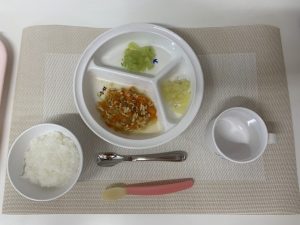 (年齢によって盛り付け量をかえて提供しています。写真は普通食です。)