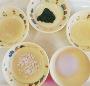 粥 すまし汁(豆腐) 白菜のすりつぶし ほうれん草の裏ごし 煮りんご